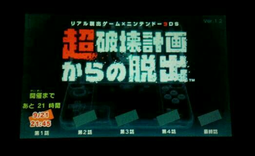 超破壊計画からの脱出 第1話 その他 2015年09月21日 前回の記事で無料体験版をやってみた3DSの『超破壊計画からの脱出』ですが、今なら期間限定で第1話が無料で遊べます。早速ダウンロードしてみました。しかもオンラインで他の人と協力してできるチケット付きでした。私は明日の夜に予約を取りました!もし、できる方は一緒にやってみませんかー?楽しみー。
