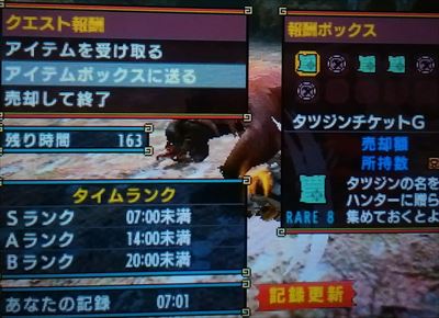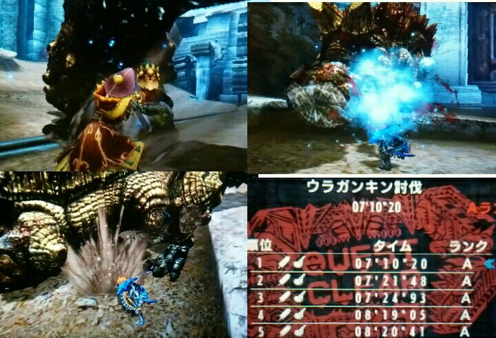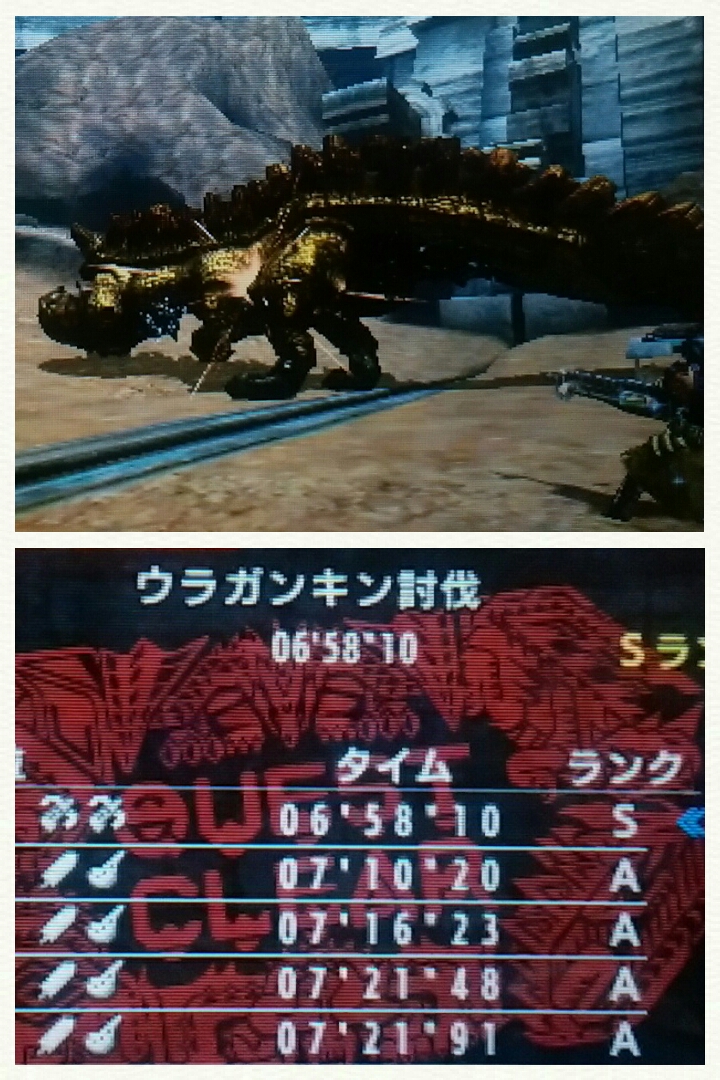 闘技大会ウラガンキンのSが取れない(イャンガルルガはタイム更新)【MHXX】 モンハン 2017年06月04日 こんにちは。 昨日は、夕方から夜中まで(休憩のため中断はしました)ずーっとretさんと闘技大会を頑張っていました。 前回、retさんと遊んだ時には無理だったイャンガルルガとベリオロスではSが取れました。 イャンガルルガの方はタイムも更新しました ♪ まずはイャンガルルガ。 ギリギリ取れなかったりしつつ ↑ も最終的にはS獲得 ↓ 弓(retさん) × 双剣(うたこ) で 04:21:30(記録更新)でした。 いえーい! ベリオロスは・・・ ライトボウガン × ライトボウガン で 04:31:90 でした。 初めてクリアした時の記事に書き忘れていたけど、ベリオは最初に翼を破壊するのがSゲットへの近道です。 火炎弾LV2で最初に翼を撃ちまくれば結構すぐ壊れます。 そのあとはひたすら頑張って撃ちまくることです(笑) 次、ウラガンキンいきます。 こいつが大変で大変で結局Sが取れていません。 途中で出たこの記録 07:10:20 が現時点の自己ベストです。 その後は、さっきの記録を越えることもなく、たぶん集中力的なものがなくなってきたんでしょうねぇ。 Sが取れないまま解散しました。 何回やったかわかりませんけど、クリア画面の写真が15枚はあるので少なくとも15回はやったんだと思います。 たまには弱い固体とか出てきても良いよ(?) 基本的に、笛(retさん) × 大剣(うたこ)を選択しています。 ヘビィボウガンが良いという噂も聞いたので、ちょっと練習してみましょうか・・・。 (うちの闘技場のランキングでも一位の人は ヘビィボウガン × 大剣 でした) ガンナーは個人的にかなり難しいけど、ベリオロスも一応それでいけたので、やるだけやってみます。 retさん、 お疲れ様でした&ありがとうございました~! また続きやりましょう o(`^´*) 他のモンハン記事はコチラ→モンハン