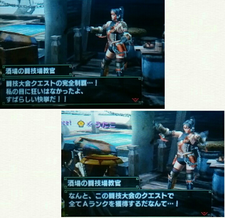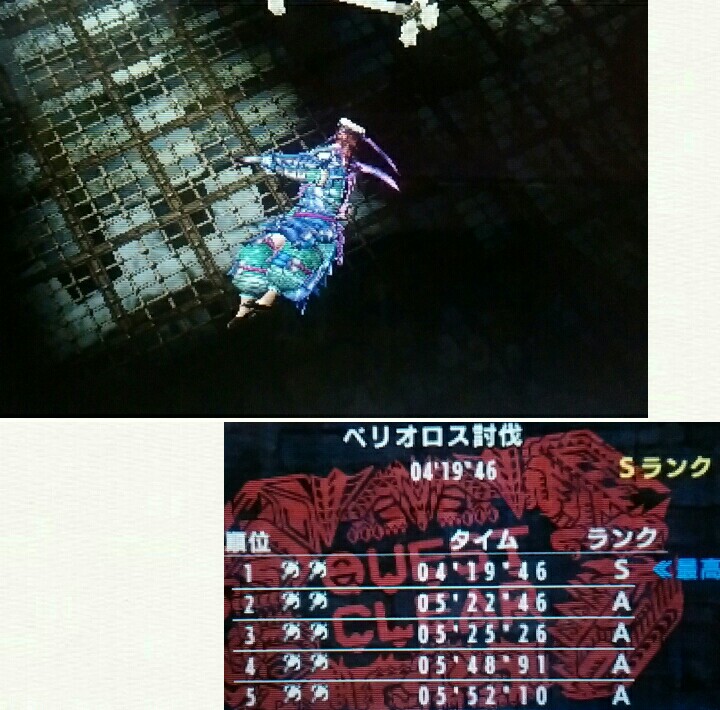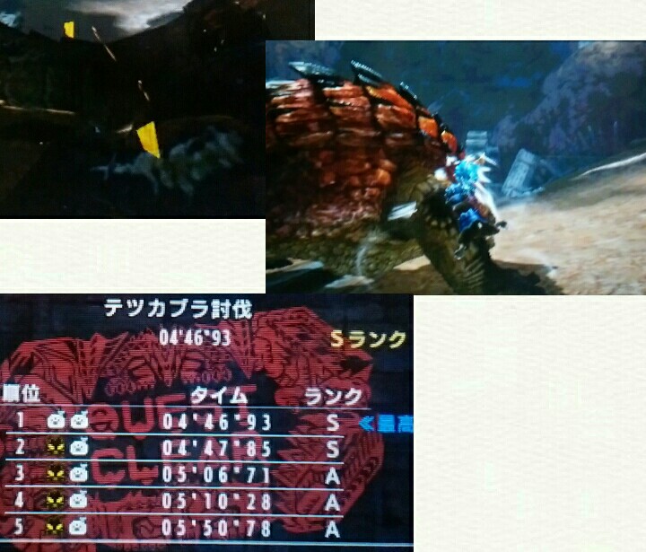 闘技大会イャンガルルガ&ベリオロスS獲得【MHXX】 モンハン 2017年06月03日 こんにちは! 昨夜は、デカマルコさんと闘技大会を頑張りました。 私はニャンターはSを全部取れていて、デカマルコさんはババコンガとテツカブラがまだだったので、まずはこの2頭。 写真を撮れてないけど、2回目でSゲットできました。 カリスマ(デカマルコさん) × ボマー(うたこ)で 6:57:43 でした。 テツカブラは順位も更新。 コレクト × コレクト で 4:46:93 でした。 ついでに人間も頑張りましょう。 私は、先日ブシドーが下手すぎる大会からソロで少し練習していたのですが、なかなかうまくなりません。 特にガンナーはすぐ死ぬので苦手です。 敵の攻撃に当たらなければ良いのかもしれませんけど…当たりますって! イャンガルルガは弓が使えないとSは難しいという噂だったので、デカマルコさんに頑張ってもらいましょう。 本当は弓2人でいけるみたいだけど、私は双剣ソロSの動画を見て少し練習したので、双剣で行くことにしました。 いけました! クリア後の順位写真を撮り忘れ♪ 弓(デカマルコさん) × 双剣(うたこ)でSゲット! 4:48:45 やったね! そして、ソロで結構ライトボウガンの練習をしたベリオロスも行ってもらうことに。 ダメです、何回行ってもダメです。 私、ソロでは9乙失敗とかしてたんです。 流石に二人だとそれはないけど、時間はなかなか縮みません。 そして、照準を出す時のRボタンもいよいよ危ういです。 あまりに厳しいので、パネルも闘技大会ベリオロス専用のこちらに設定。 左上は自分以外のハンターの体力などを見るパネルです。 今回見てる余裕はありませんけど、私は普段から下画面に出してるので、上画面に表示されるとやりにくいと思ってそのまま下に置きました。 わたし的に特筆することは、アイテムのパネルです。 普段使うことはないショートカットになります。 一秒でも縮めたい闘技大会で、しかも使う道具はこの4つだけなので、セットしました。 結局、これでも5分以内にはならなかったので、一旦休む事にしました。 そして、今日、再度挑戦してSがとれました~! ・・・なんという情けないクリア画面か。 最後の最後に頑張りすぎて死んでしまいました。 が、未だかつてない速さでクリアできたので、勝因は、死を恐れない心ですかね?! ライトボウガン × ライトボウガン で4:19:46 でSゲットです ♪ あとはウラガンキンとセルレギオスがSを取れてないので、少しずつ頑張ろうと思います。 デカマルコさん、 お疲れ様でした&ありがとうございました~! 残りのモンスターも頑張りましょうね~(^^) 他のモンハン記事はコチラ→モンハン