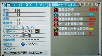 Rボタンが悪くても集会所で遊ぶ【MHXX】 モンハン 2017年05月30日 こんにちは! 昨夜もいつもの「出入り自由・何でもOK・Z順」の集会所を作りました。 最初はデカマルコさんとペアで。 遅い時間にも関わらずその後、retさん、ドナマリさんが来てくれたので4匹で色々と。 戦い中にはほとんど感じなかったけど、エリアチェンジしたモンスターを追いかける時に走りにくいと感じたりしました。 Rボタンの不調はやはりありますね・・・。 それぞれ可愛い(ΦωΦ) 超天眼で、力尽きた回数通算 900 回突破!しました~(^・ω・^) おほほほほ・・・。 ここからはデカマルコさん、retさんと3匹で最後まで遊びました。 そういえばretさんとはピクニック以来でしたね。 解散前に、カールおじさんのコスプレ装備を披露できて良かったです(笑) これを何かの見た目装備にしても良いかなと思ったけど、たぶん胴・腰・足がイベクエ装備だから使えないんじゃないかな~。 デカマルコさん、 retさん、 ドナマリさん、 お疲れ様でした&ありがとうございました~! New 3DS のRボタンは、やっぱり少し変なので無償修理期間中に直してもらおうと思います。 USJに行ってクエストを受信して遊んでからですね。 修理期間中は古いDSで最初からキャラを作って遊ぶかもしれないので見かけたら手伝ってくださいm(_ _)m 他のモンハン記事はコチラ→モンハン
