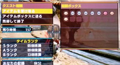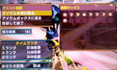 また吹き出しクエストが増えました【MHXX】 モンハン 2017年06月07日 こんにちは。 昨日USJのモンスターハンターザリアルに行ってきたので、あとでそのことも書こうと思っています。 その前に、村人の依頼クエストが増えて衝撃を受けているので記しておきます。 もう全部終わったと思い込んでいました・・・。 今、私の中で闘技大会ブームが来ています。 現時点でニャンターはすべてSが取れましたが、ハンターはまだ残っています。 よく選ぶ武器では、スタイルがブシドーのことが多いので、練習がてらブシドーでG★3のクエ埋めに行ってみました。 本当にブシドーが下手です。 ↓ クリア失敗の画面(今際の際) ニャンターでもボマーなのに回避できない事が多いんですよ。 納得です。 それでもなんとか獰猛ショウグンギザミを倒したところ・・・ 最小金冠も出てラッキー! と、思ったら、吹き出しが・・・! わぉ! 今更また依頼クエが増えました~(^^;) ということがあったんですな。 びっくり! 他のモンハン記事はコチラ→モンハン