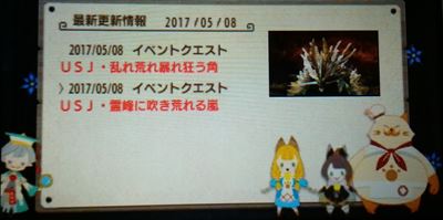 USJイベントクエスト等々で遊びました【MHXX】 モンハン 2017年06月08日 こんにちは。 昨日は、夜の早い時間にUSJイベクエ部屋を建てました。 最初の30分ぐらい誰も来なかったので、一人で「USJ・霊峰に吹き荒れる嵐」をやっていました。 途中でretさんが来てくれたので、ちょっとお待たせして戦ったけど倒せそうにないのでリタイアして集会所に戻りました。 サブターゲットは既にできてたから、すぐにサブタゲ帰還すれば良かったと今は思います(笑)←よくある それで、二人・・・というか二匹でもう一つのイベントクエスト「USJ・乱れ荒れ暴れ狂う角」を2回やりました。 ちっちゃい可愛いディアブロスの角破壊です。 ニャンタークエです。 こんなにかわいいディアブロスは飼いたいね~! ってことで捕獲する計画を立てたりしました(^^) 2回でスタジオNパスが4枚揃ったので、オトモの装備一式が作れます。 早速作って、ギルドカードを変えました。 それから、夜遅い時間にまた集会所を作りました。 今度は、いつもの「出入り自由・何でもOK・Z順」部屋にしました。 デカマルコさん、retさんが来てくれました。 最初に選んだのは「USJ・霊峰に吹き荒れる嵐」 1ニャンター&2ハンターズで、失敗してしまいました(3乙)。 なので、2ニャンターズ&1ハンターでリベンジ! 虹も撮れました ♪ なんとこの1戦で、私はスタジオXXパスを一気に7枚手に入れました。 1ページ目の1つで3枚、2ページ目の2つ×2枚ずつで、合計7枚です。 こんなにイベントの報酬がどっさりもらえることって珍しいですよね?! ラッキー! 装備を作りましょう! その後、ドナマリさんも遊びに来てくれて、皆で黒炎王を狩ったり 金銀夫妻を狩ったり 荒鉤爪(超)を狩ったり 再度、アマツマガツチを狩ったり (また虹写真ゲット!) 黒炎王(超)を狩ったり 黒炎王(超)で様子が少しおかしかった(眠そうだった)猫ちゃん達がお帰りになり、最後はデカマルコさんと2匹で、かわいいディアブロスの角を破壊して終わりました。 USJの先行配信イベントクエストも楽しめたし、超特殊許可や金銀も楽しめたし、これで心置きなく・・・はないけど・・・DS本体を修理に出せそうです。 少しの間、古いDSで2nd.キャラを作って遊ぶかもしれないので、見かけたら手伝ってください! そして、戻ってきたらまた1st.キャラとも遊んでください。 retさん(2回も来てくれて感謝)、 デカマルコさん、 ドナマリさん、 お疲れ様でした&ありがとうございました~! 他のモンハン記事はコチラ→モンハン PR