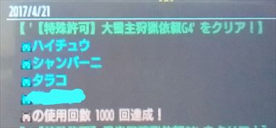 USJイベントクエストぶん回し部屋【MHXX】 モンハン 2017年04月22日 こんばんは。 先程、月隠師匠の「USJぶん回し第2夜」にお邪魔していました。 下位「USJ・幻惑なる2頭の輪舞曲」 上位「USJ・天翔ける輝星の軌跡」 を貼ってもらいました。 私は以前、クロさんがUSJイベクエ部屋を作られていた時にスタジオOパスの方を何枚か貰っていたのですが、作ってみたら人間用は強化するのに枚数が足りなかったので、今日増えたのがありがたかったです。 このあとは自由に選ぶタイプのお部屋に変わりました。 夕方、ひとりで(ハンターでオトモ2匹連れて)行ったけど時間切れだった黒炎王狩猟依頼G3を貼らせてもらいました。 ニャンター×4でクリア♪ やっぱりひとりでやるより楽しいし勝率高い!! 今日はずっとニャンターで参加しました。 というか皆ずっとニャンターでした。 ついに私もニャンターの使用回数が 1000 回達成!しました~(ΦωΦ) わーい ♪ お部屋を開いてくれた 月隠師匠、 月隠師匠のフレンド様方、 retさん、 お疲れ様でした&ありがとうございました~! 他のモンハン記事はコチラ→モンハン