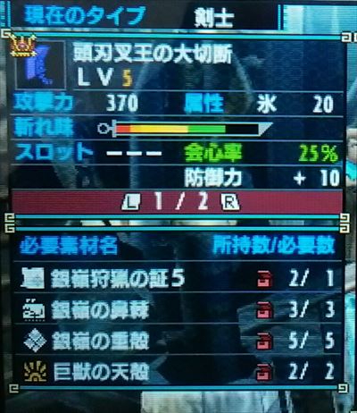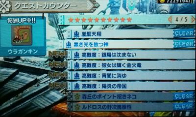 モンハン進捗状況(ネタバレ含むのでご注意ください)【MHXX】 モンハン 2017年04月19日 ここからは主に村クエの話なので見たくない人は見ないでください。 やっぱりオンでのネタバレは仕方ないけど、村は自分で進めたときに知りたかったーとかありますよね? といいつつ、オンでの話からします。 先日、ミラボレアスを倒したときのことです。 書き忘れてたんですけど、あの時、私はモドリ玉の材料を持って行ったんです。 いや、持って行ったつもりだったんです。 なんとドキドキノコと毒テングダケを間違えて持っていたので、途中で作った時に毒けむり玉をたくさん作ってしまいました。 という馬鹿な報告です。 でもさー、見た目同じだから間違える事ありますよね? あの時、倒せたから結果オーライですけど、そういえば、誰にも告白しなかったけど、なんかおっちょこちょいでスイマセン(^^;) これは、NEW!って付いてるのにCLEARも付いてるっていうのが面白いので記念撮影しました。 もう、本当に度々!スクショさせてくれって思ってます! なんなのカプンコ!プンスコ! こちらは、納品依頼されていた金剛魚を釣りにいったときの様子です。 小嶋Pにすれ違いでもらったいっちゃんが「黄金魚の術」を持っていたので、G級の雪山で釣りをしたら、すぐに集まりました。 こんなに簡単ならもう少し早く行っておけば良かったな~。 それから、村クエで、★10がまだ残っているのですが、もう本当に高難度のクエストしかなくて、なかなかやる気になりません。 が、やるしかないか!と思って、「高難度:モンスターハンター」に挑戦してみることにしました。 1回目は失敗したので、装備を変えて再挑戦! 倒せました~!やった~! ポッケ村の村長さんに耳当てをもらいましたよ ♪ 次のクエストもちょっとやってみたんですけど、失敗しました。 しかも、こやし玉のつもりで、モンスターのフンをポーチに入れてました。 もう、学習しないんだから~! 戦いながら、モドリ玉を作ろうとしてこやし玉を作ってしまい、死にました。 装備よりも、アイテムのこと(使いやすい順番とか)をちゃんと考える方が重要かもしれません。 こんな感じでゆっくりだけど、確実に村クエもクリアしていきたいと思います。 頑張るぞ~! アイテムボックスが23ページ目まできて焦ってますけど。 他のモンハン記事はコチラ→モンハン
