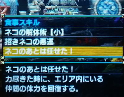 鏖魔狩猟依頼G5をクリアしました【MHXX】 モンハン_猫ハーレム 2017年04月16日 こんにちは~。 昨日は、夕方にもオンで狩りをしましたが、夜もまたしっかり狩りをしました。 夕方に鏖魔狩猟依頼G5がクリアできず、持っている装備でスキルを変えて、夜のオンまでに鏖魔用セットをひとまず準備しました。 こちら ↓ メンバーは、夕方と同じくretさん、デカマルコさん、私です。 (うたこ、タラコ、デカマルコ) が、仲良死してしまいました。 やっぱり武器が水じゃないと!ということで、私とデカマルコさんは武器作りからすることに。 優しいretさんにも付き合ってもらいました。 天眼狩猟祭 ♪ あとは尻尾があれば・・・ っていう時に、尻尾より良さげな紫靱尾が出ちゃったり。 1乙もしちゃダメなクエストで「ネコのあとは任せた!」が出たり。 (本当に発動しているところは初めて見たかも? ) デカマルコさんとこのニャンター武器、私の大剣(最終強化)が完成しました。 ↓ こんな感じ (当時は幸運は付いていませんでした。オンが終わってからお守りを付け替えたら幸運も付いたので、写真は現在の鏖魔用セットのものです。) 武器のスロットが3から0になったので、ちょっとスキルが減った(挑戦者+2→挑戦者+1)けど、なんとなく良い感じですね。 そして、遂に・・・! 鏖魔狩猟依頼G5をクリアしました~! 2匹と1人で! 記録上は0乙です(笑) クリア画面、私ひとりで逃げてて情けない感じですけど・・・(^^;) うわー、なんか恐ろしそうなの出てきたー! でも、本当、クリアした時は気持ちよかったです~。 MHXでニャンターだけで円舞獰乱をクリアした時の爽快感を思い出しましたね~。 わいー! retさん(たまねぎグミ付き)、 デカマルコさん、 お疲れ様でした&ありがとうございました~! お二人とも夕方から合わせて超長時間お付き合いいただき感謝です。 また遊びましょう! 他のモンハン記事はコチラ→モンハン 他の猫ハーレム記事はコチラ→猫ハーレム