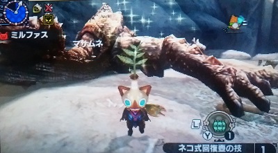 もう捕獲できる確信があったので、麻酔玉も投げずしゃがんでポーズを決める悪い猫。