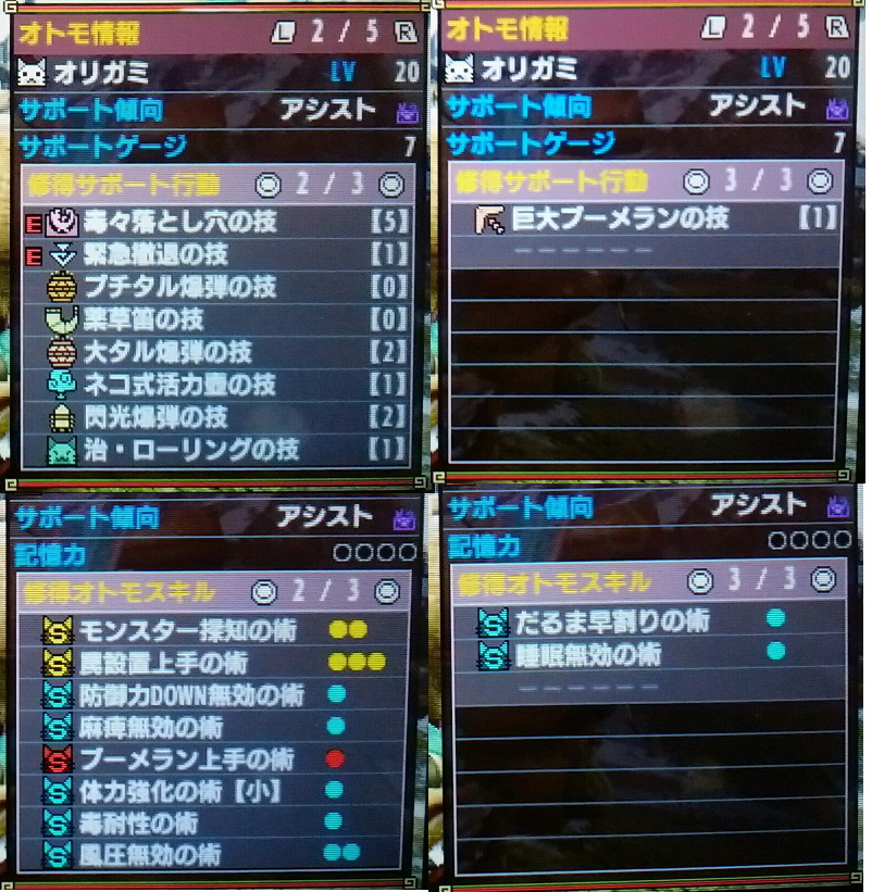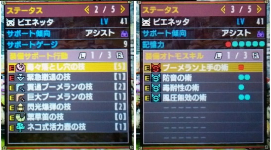 新しくオトモアイルーを雇用しました(^・ω・^)【MHX】 モンハン 2017年02月21日 こんばんは☆ 少し前のブログ記事にもちょっと書いたんですけど、なんとなく円舞獰乱用のニャンターを雇おうかな~と考えていました。 こんな感じ ↑ の猫ちゃんが居たら良いな~と思っていました。 オトモスキルの( )は、三つのうちどれか一つ付けようかなっていう感じです。 そうしたら限りなく近いコが居たのです。 このコを雇用します! こやし玉の技は諦めました。 名前は、私が名付けたオトモは皆お菓子なので「ビエネッタ」にしました。 毛並みもちょうど良い感じにバニラとチョコっぽいです。 ちなみにビエネッタは私の大好きなアイスクリームです。 それから、「祝・自分で雇ったコ達が皆LV50になりましたฅ(*ΦωΦ*) ฅ」という記事で、残るこの子を育てたら配信以外の皆LV50になりますと紹介したララと一緒に何度か隻眼狩猟依頼10をやりました。 ララのレベルが50になったので、あとは私がどうしても最後まで育てたい子はビエネッタだけになりました。 その後、何度か隻眼をやって、理想のサポート&スキルを装備できるレベルにまで達しました。 これでニャンターは準備万端。 ここからは、私の腕を磨くしかないです。 「円舞獰乱」、練習します! 他のモンハン記事はコチラ→モンハン
