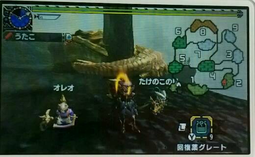 ゲネル・セルタスやらクエ埋めを手伝ってくれました【MHX】 モンハン 2016年05月25日 こんにちは。 オトモ装備のためウラガンキンを一人で何頭も狩っていたのですが、「なかなか疲れたな~」というような内容の事をTwitterで呟いたところ、手伝ってくれると名乗りを上げてくださる方がいらっしゃいました。 モンハン部のフレンドの方にもそういうときこそオンラインと言っていただきました。 本当にありがたいことです。 Twitterとかモンハン部があるから今までのシリーズよりモチベーションを維持しやすいような気がします。 さて、前置きが長かったですが、そのTwitterフレンドのお二人を誘って久々にお部屋を作りました。 一人目のお客様、はーくん。 「お久し振りで~す」 はーくんには今まで何度か私の素材集めやクエ埋めを手伝ってもらっていて、Twitterでのやりとりはあるのでそんなに長く一緒に狩りに行ってないとは思ってなかったのですが、実に2ヶ月以上ぶりでした! (前回の様子はこちら) いつもこちらが手伝ってもらってばかりで申し訳ないわ・・・と言いつつ、早速オトモ装備充実のためのゲネル・セルタス狩りを手伝ってもらいました。 もう一人誘っていましたが、まだっぽかったので先に二人で行きました。 『難攻不落の重甲虫』です。 狩りの途中、二人目のお客様、瞑想さんがいらっしゃいました。 ゲネル・セルタスを必死で狩っていたので待っててもらい、倒してから帰還。 瞑想さん、お待たせしました。 腕が鈍ったと嘆くはーくんとお馴染み瞑想さん2号と私 瞑想さんとは、前回のオンラインもご一緒しました。 (その模様はこちら) この後は、お二人が私のクエ埋めを手伝ってくださることに。 じゃあ、お言葉に甘えて・・・集会所★7でまだクリアしてないクエをお願いします! 『熱気で熱狂! 炎の軍勢!』(イャンガルルガ、ウラガンキン、アグナコトル、リオレウス、ディノバルド in 闘技場) 『ビリビリバリバリパニック!!』(フルフル、ラギアクルス、ジンオウガ、ラージャン、ライゼクス in 闘技場) うっ、当然だけど一人でやりたくないようなのが残ってます。 流石にこれだけモンスターが出てくると3人でやっても時間がかかりますね。 どっちのクエスト時だか忘れたけど、最後、皆で罠を仕掛けまくったときちょっと面白かったので写真を撮りました。 罠を仕掛ける瞑想さん2号 ↓ あ、モンスターを倒して次のが出てくるまでの時間だったので写真が撮れたんですよ。 このあと更にはーくんが罠を仕掛けて、狭いエリアに3つも罠が設置されていてなんか笑えました。 はーくんはフルフルが好きだって言ってたのですが、忘れてまして・・・ フルフルと戦ってる時のはーくんがテンション高すぎて面白かったです。 そういえば、以前もフルフルと戦ってた時こんなんでしたね~。 フルフルの亡骸の前で呆然とするはーくん ↑ ということで、今回も色々失敗したりしたけど、笑って許してくれる二人で良かったです。 とっても楽しく、しかも苦手なヤツを倒せて有意義な狩りでありました。 また、よろしくお願いしまーす! バイバーイ はーくん、 瞑想さん、 ありがとうございましたー! 終わってからTwitterを見たら瞑想さんがこの後に村クエやってるのを知ってスゴイなぁと思いました。 ガンナーって指が疲れそうだけど慣れると平気なのかな? 他のモンハン記事はコチラ→モンハン