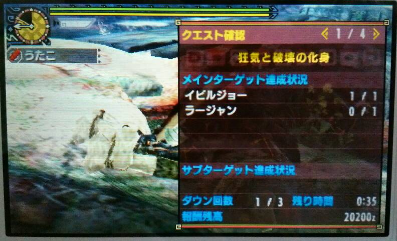 イベントクエストって難しいっすね!【MHX】 モンハン 2016年06月11日 こんばんは。 今回は携帯から更新してます。 今、イベントクエスト『狂気と破壊の化身』に挑戦中です。 (さっきこの記事を書いてる途中で携帯が固まって全部消えたのでコレ書くの2回目です。更にドッと疲れました…。) ラージャン得意かもしれない等と言っていた自分を反省します。 ラージャンさん、強いです。 参りました。 更にイビルジョーはもっとイヤなので、ラージャンを先に倒したいのですが、その時点で2乙しているという状態ですよね。 その後イビルジョーに1回やられてクエスト失敗ですよね。 そこで、作戦を変えてみることにしました! 先にイビルジョーをやっちゃおう、そうだ、そうだ。 作戦は成功したかに見えたんですけどね。 よく見たら時間が…。 これじゃほぼ無傷のラージャンを倒せないよ(´θ`llll) 焦って乙。 もう無理~。 やはり時間切れでした。 ガーン! でも、ラージャンを先に狙うよりはクリアに近付いた気がする!と思ってまたイビルジョーから作戦でやってみました。 あ、あれ? 前より時間かかってるじゃん。 もう無理だ~! はい、やっぱり無理でした。 ラージャンのお尻の下でガックリしてます。 ガックリしてるところにピョンピョン跳んできてやーいやーいって言われてるみたいで腹立たしいです。 というわけで今日までの私の惨敗記録がこちらです ↓ 最後、さっきですね、宝玉が2個出たので嬉しいですけど。 うーん、早く倒すにはどうしたら良いのかな-? 死ぬからいけないんですよね、きっと。 でも相手が強いんだよな-。 ふぅ。 頑張ります。 他のモンハン記事はコチラ→モンハン