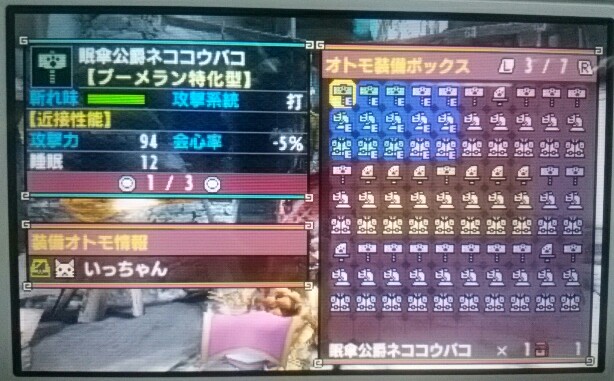 オトモ装備を充実させたい【MHX】 モンハン 2016年03月06日 私が今一番力を入れていること。 それがオトモ装備の充実です。 今までのシリーズでオトモ装備を揃えるのが大変だったので、今作MHXではやるまいと思っていたのですが、やっぱり無理でした。 始めてしまいました。 だって、オトモ装備かわいいし、揃えたくなるじゃないですか~!! 今回はニャンターもあるからそんなに無駄なことでもないですし、はい。 武器だけで防具がないのとか気になります。 几帳面なので。 今さら作っても強くもないんですけど、もう、コレクションとして作らないと気持ち悪くて。 と、こういう感じの抜けがある装備がまだまだあるので、まず自分の装備作りよりもHRよりもクエ埋めよりもオトモ装備埋めが気になっている今日この頃です。 さぁ、頑張ろう。 他のモンハン記事はコチラ→モンハン