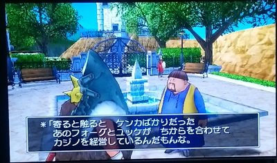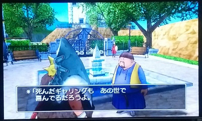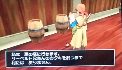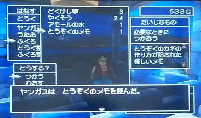 滝の洞窟とリーザス像の塔クリアしました【DQ8】 ドラクエ 2016年10月25日 昨日は4時間もドラクエ8をしました。 写真撮りながら間違えたりしながらだったので時間の割りには進んでいませんけどね。 早速、前回の続きです。 トラペッタの南にある滝の洞窟へ。 えっ!進むには戦わないといけないのか・・・。 と思ったけど、話しかけてみると案外そうでもなかったです。 せっかくそうでもなかったのに、無駄に話しかけたせいで結局戦うことになりました。 で、奥に行ったらありました、水晶玉。 こいつと戦って勝ったらもらえました ↓ ルイネロが滝壺に水晶玉を捨てたせいで怪我したらしいです 渡しに行きました。 ルイネロが水晶玉を捨てた理由は娘ユリマのためでした。 なんやかんや話を聞いて、ドルマゲスの事を占ってもらいました。 ドルマゲスはトラペッタに住んでいたライラスを殺して南の関所を破って行ったとのこと。 関所は洞窟に行く前に見に行きましたけど、通れなくなってたはずです。 関所を守ってた人たちはどうなったんでしょう。 ついでに、トラペッタには盗賊の鍵を売ってる店があったので、手に入れてから町を出ようと思いました。 が、売り切れたと言われました! 鍵のかかった宝箱も2個ぐらいあったのに~! 代わりに、こんなのを拾いました ↓ とうぞくのメモ 盗賊の鍵のレシピです。 そういえば、宿屋で寝るとトロデがなにやら作ってる様子が垣間見えます。 錬金釜って8でしたっけ? 今回はそんなに真面目にぜんぶ揃えようとか思ってないので気楽に楽しもうと思ってます。 関係ないけど、この人 ↓ バナナマン日村に見えました そして、関所へ。 壊されてますね~。 人もいません。 ドルマゲスに殺されてしまったんでしょうね、名も無き門番さん。 次のリーザス村は、入る前から何となく見たことあるな~と思いました。 ちょっとは覚えているみたいです。 どうも、ゼシカがいるみたいです。 仲間になるかな? 覚えてないな。 ゼシカは村の名家のお嬢様らしいです。 兄が何者かに殺され、家で喪に服していました。 屋敷に入るとねずみが通る穴! こ、こ、これは、私がなんとなく覚えていたというシーンではなかろうか。 やっぱりそうでした。 トーポで潜入。 ゼシカが書いた手紙をGETしました。 これはもう東の塔に行くしかありません。 村の人間しか開け方を知らない、塔の入り口 ↓ 村の子供に開けてもらいました。 兄の仇と間違えられ、ゼシカに襲われそうになりましたが、兄の声をリーザス像が届けてくれたお陰で誤解は解けました。 ゼシカの兄を殺したのはドルマゲスでした。 でも、ここでゼシカが仲間になってくれるわけではなく、そっとしといてと言われたので帰りました。 村に戻ると、ゼシカが兄の仇を討つと旅立っていきました。 あ~、まだ仲間になってくれないんだ~。 とりあえず、ゼシカの普段着(セクシーじゃない方)を箪笥から盗んで追いかける事にします。 村の子供によるとゼシカは港町ポルトリンクに行くって言ってたそうです。 次に目指すのはそこかな~?