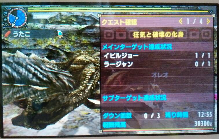 イベントクエストって難しいっすね!【MHX】 モンハン 2016年06月11日 こんばんは。 今回は携帯から更新してます。 今、イベントクエスト『狂気と破壊の化身』に挑戦中です。 (さっきこの記事を書いてる途中で携帯が固まって全部消えたのでコレ書くの2回目です。更にドッと疲れました…。) ラージャン得意かもしれない等と言っていた自分を反省します。 ラージャンさん、強いです。 参りました。 更にイビルジョーはもっとイヤなので、ラージャンを先に倒したいのですが、その時点で2乙しているという状態ですよね。 その後イビルジョーに1回やられてクエスト失敗ですよね。 そこで、作戦を変えてみることにしました! 先にイビルジョーをやっちゃおう、そうだ、そうだ。 作戦は成功したかに見えたんですけどね。 よく見たら時間が…。 これじゃほぼ無傷のラージャンを倒せないよ(´θ`llll) 焦って乙。 もう無理~。 やはり時間切れでした。 ガーン! でも、ラージャンを先に狙うよりはクリアに近付いた気がする!と思ってまたイビルジョーから作戦でやってみました。 あ、あれ? 前より時間かかってるじゃん。 もう無理だ~! はい、やっぱり無理でした。 ラージャンのお尻の下でガックリしてます。 ガックリしてるところにピョンピョン跳んできてやーいやーいって言われてるみたいで腹立たしいです。 というわけで今日までの私の惨敗記録がこちらです ↓ 最後、さっきですね、宝玉が2個出たので嬉しいですけど。 うーん、早く倒すにはどうしたら良いのかな-? 死ぬからいけないんですよね、きっと。 でも相手が強いんだよな-。 ふぅ。 頑張ります。 他のモンハン記事はコチラ→モンハン PR