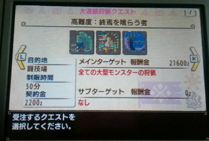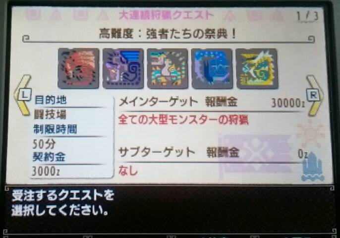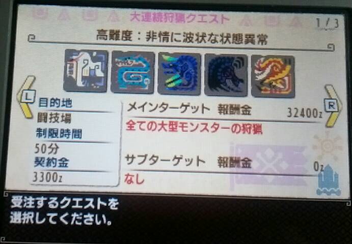 クロスって簡単なんじゃない?→嘘です、ごめんなさい【MHX】 モンハン 2016年03月01日 インフルうたこです。 いや、もうインフルエンザはたぶん大丈夫です。 吸入タイプの薬も今夜が最後です。 咳はそもそもインフルエンザの前から続いていたので、明日そのための受診に行ってきます。 アレルギーの検査結果も聞くんですけどねぇ・・・。 知ってますよ、杉とヒノキですよ、そんなの昔からですよ。 問題は動物なんですよねぇ。 5年ぐらい前の血液検査では大丈夫でしたが、今回の検査で陽性だったらイヤだな~。 動物好きなんです! ウチにオトモいるし! さて、私の体調の話はどうでも良いです。 だいぶ熱も下がってゲームに耐えられるようになったので村クエなどを進めておりました。 その前に、今作のダウンロードプレゼントって大盤振る舞いですよねぇ。 以前、調合書を埋めるのに一番苦労した「フエールピッケル」を! 31個も!くれました! まぁ、こういうコツコツやるの好きじゃないので嬉しいプレゼントです(笑) 調子に乗ってきたのでお菓子を食べながらモンハンやります。 このお菓子 ↓ 初めて見ました。 美味しいです。 さて、村★6もそろそろ終わりかな~?なんて思いながら 『宿命の四天王』なるクエストをやりました。 タイトルがもう終わりっぽいじゃないと思って。 あれ?思ったより簡単に倒せたよ、上位の武器と防具だからかな? 前の村クエはもっと大変だったじゃない~と思いました。 あ、でも、クリアの色が ↓ なんか★5までと違うような・・・ いや、でも勲章『クロスの紋章』とかもくれたし。 終わりだよね? ちょっと集会所で鉱石集めとかして戻ったら あ、あれ・・・?増えた? 村クエ増えた? もう~、キリンやったじゃないの。 違う場所に出たのかよっ! 仕方ないな~。 倒したよ! (私1回ダウンしてるし・笑) あ、あれ・・・?村長が何か言いたげだわ。 ひぃいぃ~!また増えた~。 村クエ終わらない~。 しかも強そう~! こわい~! ユクモ村の村長まで~! ふ、増えた~! 全部、闘技場なんですけど。 順番に出てくるんでしょうか? まさか同時じゃないでしょうねぇ。 同時なら無理だよ。 しかもコレで終わりなんでしょうねぇ? 必死に上記クエ終わらせたと思ったらまた増えるとかやめてよね。 あぁ、MH4で『団長からの挑戦状』がなかなかクリアできなくて挫折しかけた時の事を思い出してきました・・・。 また熱が出そうです。 他のモンハン記事はコチラ→モンハン PR