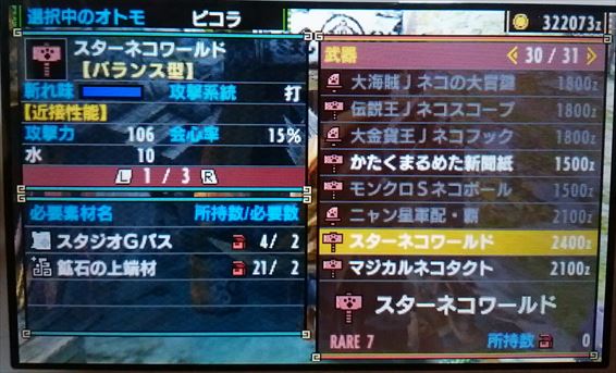 スターネコとマジカルネコ装備作りました~!&クエ埋め少し進みました【MHX】 モンハン 2016年04月29日 こんばんは! 先日USJ先行配信クエストを一緒にやってもらって「スタジオGパス」「スタジオWパス」が集まりました、うたこです。 左からスターネコシリーズ・マジカルネコシリーズ・ニャン星シリーズ(たぶん) 集まったパスでお目当てのUSJネコ装備を作りましたよ~ ギルドカードを編集する楽しみも増えました♪ ところで、皆様は二つ名の狩りは進んでいらっしゃいますか? 私はまだ紅兜アオアシラ・大雪主ウルクスス・黒炎王リオレウスを少しやっただけで、あとは手付かずです。 そろそろ、クエ埋めと二つ名を平行してやっていこうと思っているところです。 心配性な私は、二つ名と戦うために装備セットをそれぞれ作りました。 写真は一例です。 そのうち、すべての二つ名に挑む予定です。 と、そんな事を呟いていたらTwitterフレンドのリザの介さんが二つ名対策装備を褒めてくださいました。これなら大丈夫、と言ってもらえたので自信を持って戦えそうです。 ちょうどクエ埋めに行こうと思っていたタイミングだったので、二つ名ではないけど、一緒に狩りに行ってもらうことになりました。 たん掘れに付き合ってもらって以来です。 私は★4のまだクリアが付いていないものを選ばせてもらいました。 交互にクエストを選んで 「遺跡平原でキノコ狩り」 「ライバルの激突!!」 「ドクターの毒×麻痺毒研究」 「グレート・ハンター・ゲーム」 「マダラなアイツにご執心」 をやりました。 だいぶ埋まってきたかな。 私はHR105まで上がりました。 ひとりでやると辛くなってきたクエ埋めも楽しく終わらせる事ができました。 リザの介さん、どうもありがとうございました~! また遊びましょうね~♪ 他のモンハン記事はコチラ→モンハン PR