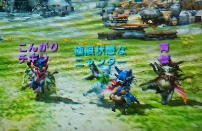 ニャンターになってコタツで狩り【MHX】 モンハン 2017年01月09日 こんばんは。 先日、retさんにお誘いいただきまして年越し狩り以来のオンラインでいっぱい遊びました~♪ 参加者は、retさんとドナマリさん。 3人で遊んだので、Z順ならぬフ順でやりました(私ひとりでフ順がツボでした)。 最初はお正月っぽい和風の格好でしたけど、これはただの見た目用なのですぐ着替えました。 retさんも基本ニャンターでしたけど、たまに人でした。レア。 葉っぱにしがみついて可愛いねぇ。 卵が割れる瞬間を撮るのは難しい! 金火竜さまの大きさよ、しかし意外とコレ最小金冠が出ました~。 あの、イビルジョーってゴーヤとか言われたりするじゃないですかぁ、 私はカカオ豆に見えてきましたね。 私の記録が正しければ以下のクエストをやりました。 ①獰猛と化した鬼蛙 ②矛砕狩猟依頼9 ③幻想、地を奔る ④大雪主狩猟依頼8 ⑤宝纏狩猟依頼10 ⑥白疾風狩猟依頼9 ⑦白疾風狩猟依頼9(失敗したので再挑戦) ⑧燼滅刃狩猟依頼9 ⑨太古を照らす、白銀の太陽 ⑩太古に浮かぶ、黄金の月 ⑪円舞獰乱 ⑫四天王と暴喰の王 ⑬モンスターニャンター HR365になりました。 黒マジニャンはLV35になりました。 死んだり、最近やられまくってた白疾風9をクリアして恨みを晴らしたり、リオレイア希少種の最小金冠が出たり、素材をもらったり、ハンターになったり、ニャンターになったり、とっても楽しかったです。 また突然でも行ける時ならガンガン行くので誘ってくれたら嬉しいです。 retさん、 ドナマリさん、 お疲れ様でした&ありがとうございました~! 次はニャンターで円舞獰乱ですね…(ΦωΦ) (今回は私がハンターだった。けむり玉は途中で失敗したけどクリアできた。) 頑張ろう~! 他のモンハン記事はコチラ→モンハン PR