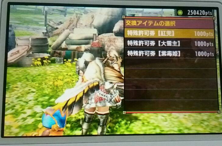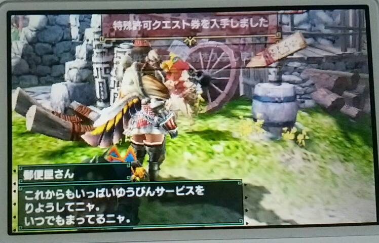 二つ名っていうヤツなのか?!【MHX】 モンハン 2016年02月06日 HRが上がったお陰で集会所の「特殊許可クエスト」というのが出てきました。 タダでは受けられないようです。 「特殊許可クエスト券」がいるんだって。 券は交易窓口でポイントと交換してくれるようですが 結構お高いんですね・・・ あの可愛くて可愛い郵便屋さんが「特殊許可クエスト券」をくれました あぁ、かわいい あ、これってもしかして・・・ 【紅兜】とか【大雪主】とか【紫毒姫】とかっていわゆる「二つ名」のヤツですね。 やっとモンハンクロスらしくなってきたのかな。 【紫毒姫】ってカッコイイな。 でも今の私は村クエ全クリアとHR上げが優先なので。 まだお楽しみはとっておきます♪ 他のモンハン記事はコチラ→モンハン PR
