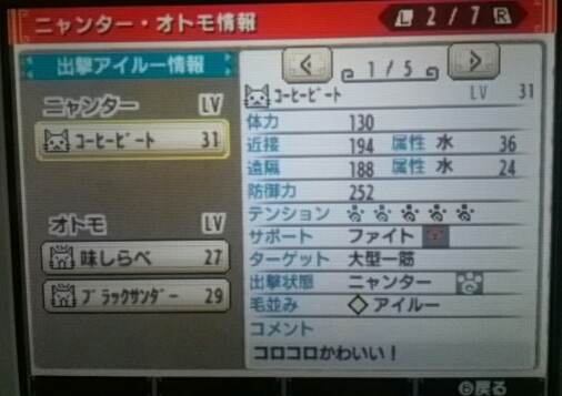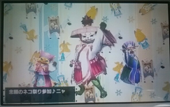 念願のネコ祭り参加♪(記念すべき10回目のオンラインでした)【MHX】 モンハン 2016年03月09日 さて、前回の記事に書きましたとおり、念願の「ネコ祭り」に初参加いたしました~♪ わーい、わーい(=^・∀・^=) ネコ祭りとは…? 私のオンラインデビューを一緒に飾ってくださったTwitterつながりの月隠(のオトモアイルー)さんが主催する「ネコを愛し、ネコを心から楽しむ」「効率やプレイヤースキルを忘れ、純粋に狩りを楽しむ」ネコの為のお祭りです。 条件はニャンターで参加すること! 第1回から「いつかは参加したい!」とずっと思っていたのですが、当時はオンライン未体験で不安だったし、村クエの最初の頃だったので指を咥えて見ておりました(笑) そして、遂に、次は私のオンライン狩り10回目という記念すべきこのタイミングで「第7回 ネコ祭り →オン初心者&ネコ練習中歓迎まったりルーム(★6まで)」が開催されるとの事。 これはもう絶対に参加したい、と。 競争率が高そうなので、開始時刻の前からそわそわしながら待っておりました。 (実際には20分前までディノバルドの狩猟とかやってしまったけど…) さぁ、いざ、開始時刻の22:22! 気合を入れすぎたため、一番乗りでした~(笑)♪ その後すぐに満席になり、ネコ祭り開始~! まずは下位イベントクエスト『マガジン・最強獣人決定戦!』 ニャンター四匹でアイルー&メラルーを合計20匹、ボコボコにしました。 (ちょっとかわいそう?) あっという間だったニャー(=ΦÅΦ=)∩ 次は私が決める番です。 ★3『熱いウロコと鋭いハサミ』をやりましょう~! これもあっという間に終わりました。 お次は★4『ニャンターこそ正義のヒーロー』 (私もこういうネコ祭りにふさわしいの考えとけば良かった~) あぁ、これも皆でよってたかってボコボコです。 あっという間に終わりました。 ニャンター強~い!! 4クエ目上位イベントクエスト(?)『USJ・絢爛華麗な舞を』 これはUSJ先行配信のクエストですね~! その時は気付いてなかったけど、参加者さん最新のモンスターハンターザリアルを体験したんですね。 良いな、良いな~。 私も今年は行きたいと思っています。 タマミツネとホロロホルルがちっちゃくてかわいかったです。 すんごいちっちゃいのに尻尾が切れたりしてそれがまたなんだかかわいかったです。 5クエ目★6(?)『クール!ザボアザギル!』 (?)が付いているのは、私のデータではまだ出ていないので確認ができないからです。 間違ってたらごめんなさい。 こちらもなんなくクリアです。 やだー、私はニャンター初心者だけど皆さんが強いからこのパーティだったら相手がすごく強くてもイケるんじゃないのー? 私、完全に調子に乗ってしまいました。 (あと、獰猛化と二つ名の区別がちゃんと付いてませんでした。) 6クエ目に、出たばかりの、モチロンやった事もない、特殊許可クエスト『黒炎王狩猟依頼1』を貼ってしまいました。 ここで主催者様から「本当は今日は二つ名は禁止だけど…」と! はっ!!皆の強さに興奮してルールを無視してしまったぁ~!わぁ~、ごめんなさ~い! でも、主催者様同様に、参加者のニャンターさんも全員やさしくて、結局このクエストを皆で行く事になりました。 決まってから「やばい…私3乙したらどうしよ…」と不安になってしまった事は言うまでもありません。 (慣れたハンターでも死ぬだろうに今の私ってばニャンターだよ…。) なんとなんと、乙ってしまいましたが、最終的には倒せましたー!!! スゴーイ! ニャンター強ーい! その後も楽しくネコ祭りは続き 7クエ目上位イベントクエスト『コロコロ・キケンなデカイ虫』 虫がデカクて気持ち悪かったです。 8クエ目★6(?)『凍てつく牙は獰猛に』 強い!でかい!怖い! 9クエ目上位イベントクエスト『範馬刃牙・最大VS最強』 同じく強い!でかい!怖い! でも巨獣の氷玉が出ました。 これたぶんレアなアレですよね?ラッキー♪ そしてとうとうラスト10クエ目です。 もう予定終了時刻ギリギリです。 上位イベントクエスト『アイルー村・ぽかぽか狩猟大会』にしました。 皆がんばって楽しく狩りができました。 名残惜しいけど、少し時間もオーバーしたし、これにて閉幕です。 とっても楽しかったです。 最初から最後までずーっと裸のニャンターさんがいてスゴイなぁと思いました。 私はいつもハンター生活のスキル付きでウロウロするのでニャンターだと地図がなくて焦りました。 最近オトモの為と言いながら大剣ばかり使っていたので、たまにはニャンターでも狩りに行こうかな、と思いました。 きっと昨日は参加できなかった人(ニャンター)もたくさんいらっしゃったでしょうし、次の第8回は遠慮しとこうかな? だけど本当に楽しかったから絶対またいつか参加したいです!! 狩り終了後のニャンター集合の図がかわいいったらありゃしない。 主催者:月隠(のオトモアイルー)さん 参加者の皆様 お疲れ様でした~! ありがとうございました~! ちなみに今回ネコ祭り参加したウチのニャンターはコーヒービート