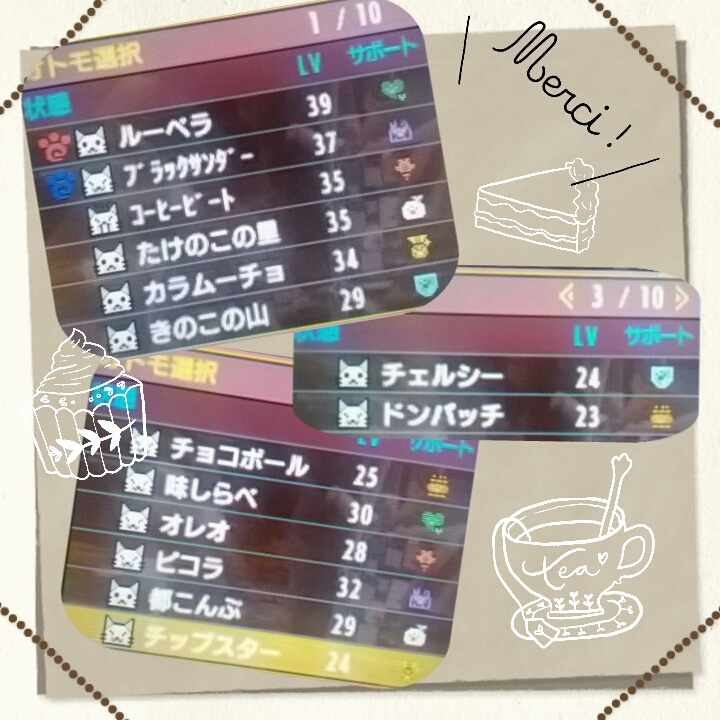 新メニュー&ウチのオトモ達を紹介します♪【MHX】 モンハン 2016年03月24日 こんにちは。 先ほど、ブログ記事を1個まるまる間違って消してしまい、しょんぼりしているうたこです。 うん、頑張ろう! 最近は、ふきだしクエをできるだけ自力で終わらせようと頑張っています。 集会所★6「ガノトトス冒険記」やりました。 獰猛化ガノトトスだったけど、装備が良くなったからヒーコラヒーコラ言いながらも一人でなんとかイケました! ブレスワインという食材をもらいました。 ブレスワイン+ベルナス=ベルナスのブレスシチュー ブレスワイン+完熟シナトマト=完熟シナトマトのワイン煮 それとっ! いつかご紹介しようと思っていた私のオトモちゃん達です 今のところ、特別配信のDLオトモはすべて雇用しています。 特別配信オトモだけで枠いっぱいになりそうな勢いですよね?! でも各サポート傾向2匹ずつは自分の作ったオトモを雇おうと思って雇用しました。 ブメ猫が強いとか知ったのは後のことなので、特に何かに優れているということは無いのですが、皆かわいい私の優秀なオトモです♪ 皆、お菓子の名前です しかも商品名www この子達が本当に優秀で、私はいつも助けてもらっています。 良いタイミングで回復してくれたり応援してくれるんだな~♪ ちょっと罠の位置が変な時もあるけど、そこもカワイイとさえ思えてきます。 はい、いつか皆様に紹介(自慢)したいと思っていたので、今日できて満足です。 では、まだまだフキダシの付いたクエストがたくさんあるので、ちょっとひと狩り行ってきます。 他のモンハン記事はコチラ→モンハン PR