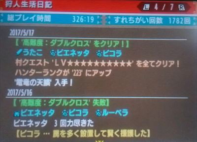 村★10「高難度:ダブルクロス」クリア(村オールクリア)【MHXX】 モンハン 2017年05月17日 こんにちは。 何度か挑戦しては失敗していた村クエ★10「高難度:ダブルクロス」をクリアしました~! 早速ギルカを変更(^^) ↑ 時間もダウン回数もギリギリでした… 昨日は、ニャンターで失敗したのです ↓ たぶん、3乙しなくても時間切れでした これで村のクエストは、 ALL CLEAR です ♪ 私の記憶が確かなら、7回目の挑戦だと思います。 最初は、ネセト防具で行きました。(結局これでクリアしました。あとで載せます。) 時間切れでした。 次は、少しスキルを変えて攻撃型にしたつもりだったのにやっぱり時間切れ。 感覚的には、最初よりも時間がかかりそう(バルファルクまでは時間がかかった)でした。 もう一度、ネセト防具でやったのかな? 時間切れだったような気がします。 4回目はニャンターでやってみよう!と思って時間切れだったのかな?(ちょっと曖昧。嘘かもしれない。) 5、6回目はニャンターで3乙しました。 猫を変えたり、装備を変えたりしたけど、無理でした。 3乙したときも、ガンガン攻撃したつもりだったので、これは死ななくても時間が絶対足りないな、という感覚でした。 なので、やっぱり人間で行ってみよう、と。 並みのPSでも何度も挑戦すればクリアできますよ、とお伝えしておきます(^^) ちなみに、その時の装備やアイテム、オトモも載せておきますね ♪ 今回は忘れ物なしでしたが、消散剤の数は間違えました。 足りなくなって何度か雪だるまになりました。 今回もウチの優秀なオトモが大活躍でした(^・ω・^) 参考になるかどうかはわかりませんが、私はこれでクリアできました ♪ これで村クエは全部終わったので、心置きなく集会所で遊べます! 他のモンハン記事はコチラ→モンハン PR