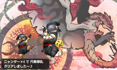 遂に、ニャンターだけでの「円舞獰乱」クリアしました!【MHX】 モンハン 2017年02月26日 こんにちは! 昨日は嬉しいことがありましたよ! ギルドカードも変更しました~(^・ω・^) そうです!遂に、念願の、ニャンターだけで獰猛金銀夫婦「円舞獰乱」をクリアしたんです! 昨夜、遅めの時間でしたが、円舞練習部屋を建ててデカマルコさんとニャンター&オトモで「円舞獰乱」の練習をしていました。 結局失敗(3乙)で終わりましたが、30分生き延びたので成長したよね~と思っていました。 2回目やるかどうかというときにretさんが来てくださり、3ニャンズで2回ほど練習しました。 黒子の装備が良いんじゃないかという話になって、装備を変えてみようかどうしようかなんて言っているところに黒子装備のドナマリさんが来てくださいました! こ、これは期待が膨らみます・・・(ΦωΦ) ちなみに、RARE4以上のオトモ装備は全て持ってますと豪語していた私なのですが、なぜか猛黒子シリーズの頭と胴だけ持ってなかったんです~! ビックリしました!本当にこの二つだけ無い(武器はあった)っていう・・・、なんなの。 ということで猛じゃない方の黒子に着替えて、今度は4ニャンズでトライです(ฅ`ω´ฅ) 2回失敗しました。 メンバー募集のツイートで書いていた終了予定時刻を大幅に過ぎていたので、そろそろ最後にしないといけないかな~なんて思いましたけど、楽しかったし、だんだんイケそうな気がしてきていたので続けていました。 そして、三度目の正直。 銀火竜を墜落させまくり、頭も壊し、尻尾も切れました。 これは、いけるのでは・・・?! いけました!銀火竜が倒れました! あとは金火竜を慎重に、慎重に。 確認したらまだこちらのダウン回数は0です。(保険があったのは秘密) これは、いけるでしょう! つ、つ、ついに・・・ クリアしましたよ~!! なんだか味気ない画面ですいません。 何も写ってない(笑) 興奮しすぎて、落し物も尻尾も本体も剥ぎ取るという行為を完全に忘れていました(^・ω・^) いやー、嬉しい♪ わーい、わーい! 本当に、みんなのお陰です。 ひとりだったら奥さんだけでも3乙しちゃうもん。 そのあと、猛黒子装備の素材を少し集めてから終わろうと獰猛ラージャン狩りにでかけました。 「怒髪に挑めと獰猛な横暴」 なんと、円舞をクリアしたメンバーなのに、1回失敗しました(笑) 燃え尽きて気が抜けたのか、 それとも獰猛ラージャンって獰猛金銀夫婦より強いんでしょうか・・・恐ろしい。 このままじゃ締まらないので、もう一度行きました。 2回目はクリアできましたよ。 ご覧の通り私は死にかけてましたけど(^^;)ギリギリセーフです。 ちなみにこの写真のラージャン最大の限界値のヤツらしいです。 見た瞬間「デカッ!」って思いましたよ~。 それにしても、円舞獰乱がニャンターだけでクリアできてとっても嬉しかったです。 お付き合いいただいた ナスリちゃん(デカマルコさん)、 マサムネちゃん(retさん)、 ジジちゃん(ドナマリさん)、 ビエネッタ(うたこ)、 お疲れ様でした&ありがとうございました~!! クリアできたけど、まだまだ遊んでくださいね♪ 他のモンハン記事はコチラ→モンハン PR
