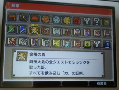 闘技大会オールSなど モンハン 2016年11月25日 こんにちは。 最近、Twitter等で楽しそうな集会所を見つけては行こうと思ってたのに行けなかったり、また落ち込んでゲームできなかったりのちょっぴり不安定なうたこです。 いや、しかし、そろそろ気持ちを切り替えて元気になろうと思います。 はい、もう大丈夫です! 良いこともありました。 普通の時間(19:00頃~1:00頃まで?)になかなかゲームができなかったため、オンラインはさっぱり遊べてなかったのですが、オフラインで闘技大会をやってまして、オールS獲りました~!! いえーい♪ こんなに勲章が揃ったの初めてです。 まだ「?」が三つありますね~。 埋めるかどうかは「?」です。 教官ってば、Aを揃えた時は泣いて喜んでくれたのに、なぜかSを獲れた時には台詞なしでした(笑) この調子でチャレンジクエストの方もS獲るぞ~! と思ったのですが、チャレンジクエストはやっぱり難しいんですね。 すぐには獲れそうにないです。 悔しいのは、慣れてる武器っていうよりほぼ大剣しか使えない私が、大剣で戦ってるのに全然うまくいかないことですよ。 他の武器もやってみるべきですかね~? でもヘタクソ部屋の為にも下手をキープしなきゃならんのでね、ハハハ、やりません。 剣系しか無理。 せめてエリアル以外のスタイルにも慣れるように頑張ります。 チャレンジクエストの『タマミツネ討伐』 私は太刀で行きました。 ギリギリまでは迫れたもののこれ以上は出ません。 あとちょっとなのにこの壁が越えられないんですよね~。 他にもしたいことがありますので、ぼちぼち普通の時間にもできるようオンラインで遊べるよう生活リズムを調整していきたいと思います。 では~。 他のモンハン記事はコチラ→モンハン PR