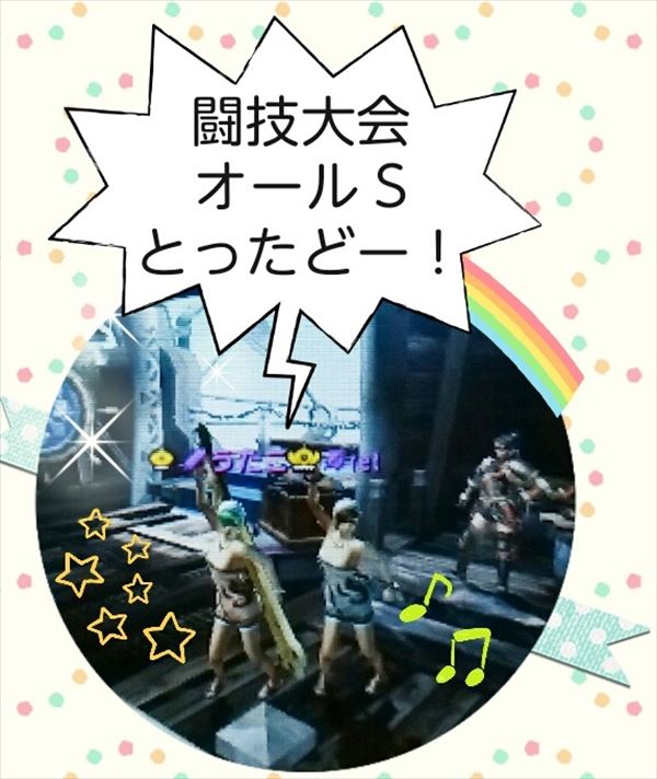 闘技大会クエスト全部Sとれました~!【MHXX】 モンハン 2017年06月26日 こんにちは! タイトル通りの自慢記事でございます(^^)わいー! 昨夜は頂上大会の放送を見て、私も残しているセルレギオスを頑張って闘技大会オールS頑張ろう、という気持ちになっていました。 retさんが付き合ってくれそうな感じだったので、お願いしました。 1回目、惜しい! いや、惜しくはないか・・・。 2回目!やった! 笛(retさん) × 太刀(うたこ)で 06:38:40(記録更新)でした。 落とし穴とか閃光玉とかアイテムを計画的に使うことが大事ですね! これで私は闘技大会クエストすべてでS獲得、勲章も増えました!! 嬉しいです。 さて、意外と早く終わりました。 retさんが闘技大会オールSになっていないということだったので、やっちゃいましょう! やっぱりウラガンキンはキツイ~!! 4回目の挑戦でSゲット。 笛(retさん) × ヘビィボウガン(うたこ) で 06:58:28 でした。 そのあとは割りとサクサク進んでいきましたね。 ホロロホルル討伐は、大剣 × 大剣 で 04:00:43(記録更新)。 フルフル討伐は、ライトボウガン(retさん) × 剣斧(うたこ) で 04:47:06。 ガララアジャラ討伐は、弓(retさん) × 剣斧(うたこ) で 04:14:06。 リオレウス討伐は、ランス(retさん) × 双剣(うたこ) で 03:54:56(記録更新)。 ケチャワチャ討伐は、ヘビィボウガン(retさん) × 太刀(うたこ) で 04:22:93(記録更新)。 少し苦戦しましたが、残りのモンスターも3回程挑戦してSゲットできました。 ガノトトス討伐は、ライトボウガン(retさん) × 大剣(うたこ) で 04:26:10。 ブラキディオス討伐は、大剣 × 大剣 で 04:04:13(記録更新)でした。 これで二人揃って、闘技大会クエスト全部Sがとれましたー!! やったね ♪ retさん、 お疲れ様でした&ありがとうございました~! チャレンジクエストも・・・またいつかやってみましょうね~(^^) 他のモンハン記事はコチラ→モンハン PR