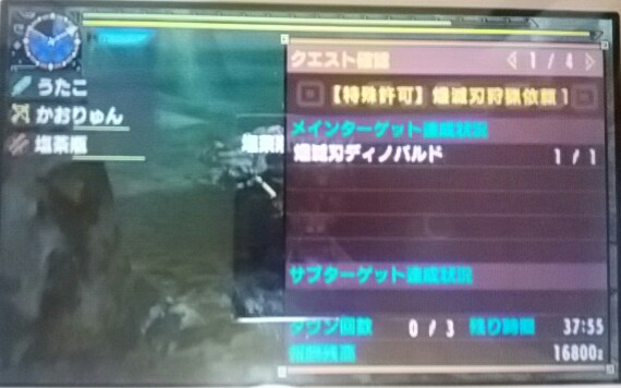 8回目オンライン♪初めての二つ名【MHX】 モンハン 2016年03月06日 ハイペースで進んでおりましてHRがどんどん上がってます。 現在HR7です。 大体オンラインで上げていただくので、一人に戻ると村人達のフキダシの数々を聞きまわりにいかなければいけません。 村人達ったらさぁ~、ものすごい色んなことをお願いしてくるんですよねぇ。 やっと村クエが減ってきた~と思ったら、また新たなお願い。 まぁ、それだけハンター不足で村人達がモンスターの被害に悩んでるって事ですよね。 困ってる人がたくさんいるならやるしかないか!龍暦院のハンターとして! なんて言いつつ、私は村人達のお願いを保留にしてオトモの装備作りをいそいそしております。 本当は自分(ハンター)のもっと良い装備も作らないといけないんですけどね、現実逃避なんだろうか(笑)? そんなこんなでオトモの為に夜中に一人で上位のリオレイアとかを2乙しながら必死に狩っておりました。 そこへTwitter&ブログつながりのかおりゅんさんから狩りのお誘いをいただきました♪ いつか一緒に素材集めでも行きましょう~なんて言っていたので早速ご一緒させてもらいました。 Twitterなどでお互いやりとりをしていたので初めてという気がしませんでした。 既に2回ご一緒しているおなじみ塩茶さんも合流して3人で… 踊ってみました♪ イエーイ! まったり♪ たまには意味もなくまったりするのも良いですね。 (真夜中に何やってんだか・笑) でも、せっかくなので何か狩りましょう~! ということで、やっぱり私のキークエをやっていただいちゃいました。 『廻り集いて回帰せん』 終わってまたのんびり~♪ 次は何をしましょうか~と相談していて、私もかおりゅんさんもまだ未体験の「二つ名」に行ってみようということになりました。 塩茶先輩、お願いします! 初の二つ名モンスターは 「儘滅刃ディノバルド」!! キャー、怖そうー! 『【特殊許可】儘滅刃狩猟依頼1』 いや、本当にね、本当~に怖かったです。 私、死ななかったのが奇跡でした。 回復薬グレート×10個と(回復薬&ハチミツ)×10個を持って行ってましたけど、手元に残っていたのは2個だけですよ。 危なかった~。 私はほとんどディノバルドの周りで回復薬グレートを使ってただけです(笑) あんな怖いのとこれからどんどん戦わないといけないんですか?! 信じられませんね~。 ひとりじゃ無理なんじゃないか…。 ひとまず、生きて帰れて良かったです。 おしゃべり中心みたいな感じだったので2クエだけでお開きに。 楽しかったです。 またまったり遊びましょ~♪ かおりゅんさん 塩茶さん ありがとうございました~! ※かおりゅんさんのブログはコチラ→『tea timeにMHXを…』 ※塩茶さんのブログはコチラ→『塩的狩猟記。』 他のモンハン記事はコチラ→モンハン PR