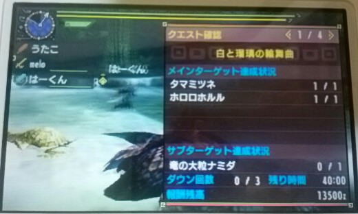 9回目のオンライン♪夜型人間多いな~【MHX】 モンハン 2016年03月06日 さて、真夜中にオンライン8回目が終わって、初めての二つ名で疲れたしオトモ装備の整理でもして寝ようかな~と思っていたところ、別のハンターさんからTwitterで狩りの話を振られたので「じゃあ…行く?」となり、オンライン狩りが再び始まりました~。 なんと皆さま夜型ですな~。 私もそうなんですけどね(ΦωΦ) ということで9回目のオンラインへGO! お食事風景を記念撮影です♪ 今日は、meloさんとはーくんと一緒に。 また私のキークエに付き合ってもらいました。 どうやら私のHR解放までしっかりばっちり付き合ってくれそうな雰囲気です(笑) 頼もしい…。 『熱愛発覚!?竜達の密会!』(ライゼクスとリオレイア) 『白と瑠璃の輪舞曲』(タマミツネとホロロホルル) 『冷たき甲冑』(ガムートとザボアザギル) やっぱり3人でやるとちゃんと早くクリアできますね~(^^) っていうか、もう基本は2頭と戦わないといけない感じですか? ずいぶん厳しいじゃないですか。 二人が倒してくれたようなものだと思います。 meloさん はーくん ありがとうございました~! 初の二つ名で疲れていた割には3クエも消化できたので満足です。 色んな人に見守られてHR解放が近付いている気がします。 HRに実力が追い付くように頑張らねば! 他のモンハン記事はコチラ→モンハン PR