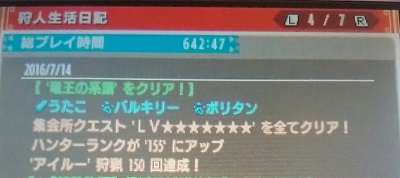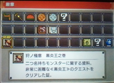 黒炎王やりました&集会所★7が終わりました【MHX】 モンハン 2016年07月16日 こんにちは。 最近、黒炎王リオレウスとちょっとずつ戦っていました。 ずっと前に黒炎王装備は作っていたのですが、全然強化できていなくてそろそろちゃんとしようと思いまして。 ちょうど家族も黒炎王装備を作ると言っていたので一緒に狩りまくりました。 先日ついに大剣と防具一式をすべて最終強化いたしました! 勲章「狩ノ極意 黒炎王之巻」もGET~! 二つ名終わるたびにくれるのかな? 黒炎王と何回も戦ったお陰で少しだけ閃光玉を投げるのがうまくなった気がします。 それから、先日のイベクエ『猫ハーレム』部屋でも『円舞獰乱』をクリアできたし今なら集会所★7『竜王の系譜』ができるかも、と思って挑戦してみました。 これだけがまだ残っていたのです。 やったー! 今まで何回やっても時間切れだったのに、14分も残ってます。 自分的コツは、キラキラ(落し物)を拾わないw先に倒した方の剥ぎ取りも諦める、閃光玉の材料も持って行く、見失ったらさっさと千里眼の薬を使う。 そういえば、これをやった時に気付いたけど、2016/7/12のイベクエ『猫ハーレム』部屋の記事内容で勘違いしているところがあったので修正しました。 やっと、集会所★7にクリアマークが付きました~(^^) 勲章「黄金のメダル」GET 勲章「天地狩猟ノ覇紋」GET あとは、黒炎王リオレウス以外の二つ名とイベントクエストですな! それと闘技大会も! そうそう、ギルドカードも変えておきましたよ 他のモンハン記事はコチラ→モンハン