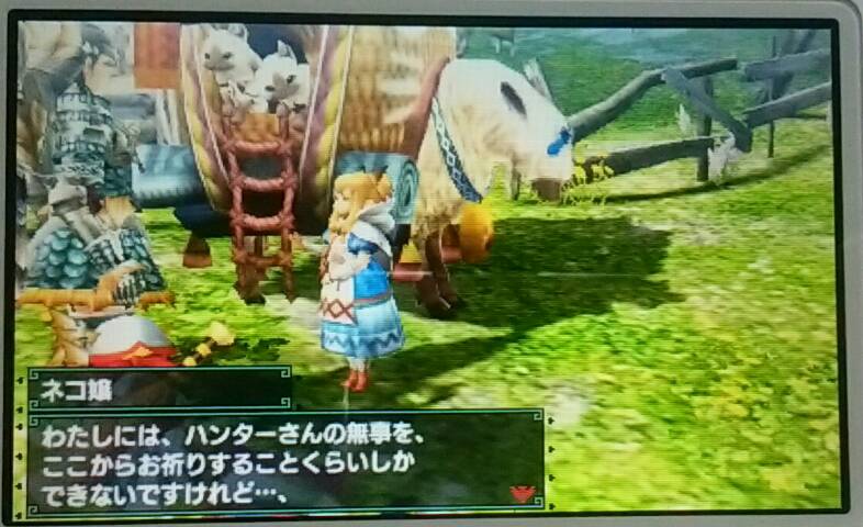 村クエ★★★★★クリア&緊急クエスト(ディノバルド狩猟)クリア【MHX】 モンハン 2016年02月05日 ついにモンスターハンタークロスのエンディングを迎えました~♪ 村クエ★★★★★が全部終わったのでこの前出てきてた緊急クエストに行ったんです。 「灼熱の刃」 メインターゲット:ディノバルド1頭の狩猟 サブターゲット:ディノバルドの尻尾切断 せっかく武器が大剣なので尻尾切断も狙ったんですけどね~、結局サブターゲットは無理でした。 でも以前は倒せる気がしなかったディノバルドが倒せて良かった。 (上手くなったんじゃなくて武器が以前より強いだけだと思うけど) クエスト行く前にやたら村人達が心配してくれたからそろそろエンディングか?と密かに思ってたんですけど、予想通り、クリアしたらエンディングが始まりました。 あまり調べないようにはしていたのですが、何となく耳に入ってきていたので何となく知ってたネコ嬢の歌♪ 可愛いなぁ、おい。 踊ってるし。 正直、ネコ嬢ってゲームの中でそこまで存在感があるわけじゃないのに、なんだかやたら人気あるなぁと思ってたんですよね。 なるほど、人気の理由がわかりました。 あのエンディングの歌とダンスにはやられますな。 『トラベルナ』(Let's ニャンス) しかも、この歌カラオケで配信されるらしいですね。 是非、覚えて歌いたいです♪ エンディングで聴いたver.の他に日本語ver.の歌詞もあるようなので、まずは日本語ver.を覚えるべきですかね? MHX以外に今ハマっている音楽投稿アプリの「nana」っていうのがあるのですが、それでも歌っている人がいました。 私もいつか覚えて投稿しちゃおうかな~♪ そんなワケで、ディノバルドの狩猟でネコ嬢をはじめ村の皆がとっても喜んでくれました。 村クエの★★★★★★(LV.6)も出てきました。 そういえばMH4の時も実はエンディングの後が結構長くて大変だった気がするわ。 これからも村クエ頑張らねばな。 ルームサービスのアイルーかわいいなぁ。 ところで、オトモのレベルが今回は50まで上がるようなのですが、ウチの子達は20で止まっちゃってます。 どうやら、私がいつまでもHR1なのが原因のようですね。 あれ?そういえば村エンディングを迎えたのに未だに私のハンターランクって1なのね。 ハンターランクって集会所クエストで上がるんだっけ? 村クエ全部終わらせてから集会所を始めようと思ってたけど、オトモを育てる為にも少しずつ集会所もやることにしようかな~。 いよいよ、ドキドキのオンラインデビューかな? モンハンシリーズをいくつかやってますが、ローカル通信の多人数プレイしかした事ないんですよ。 ローカルなら喋りながらできるじゃないですか。 インターネットプレイはどうやってコミュニケーションをはかるんでしょうか? 恥ずかしながら未経験なのでちょっと怖くもあります。 幸い、モンハン部やTwitterで優しそうなハンターさん&ニャンターさんと仲良くしてもらってるから、まずはその先輩達と狩りに出かけて色々と教えてもらいたいと思います。 のんびりやってたけど、とりあえずエンディングを見ることができて少しだけ気が楽になりました。 でもまだまだこれからですよね! うん、頑張ろう! 他のモンハン記事はコチラ→モンハン