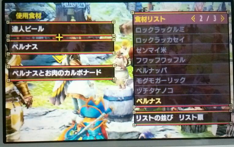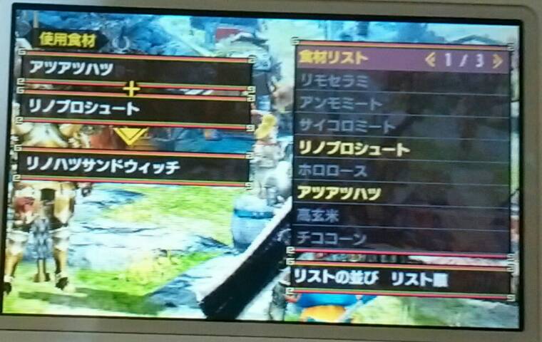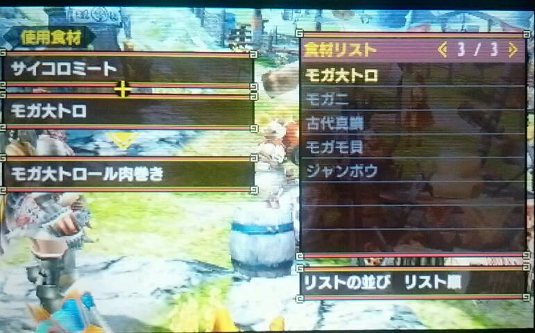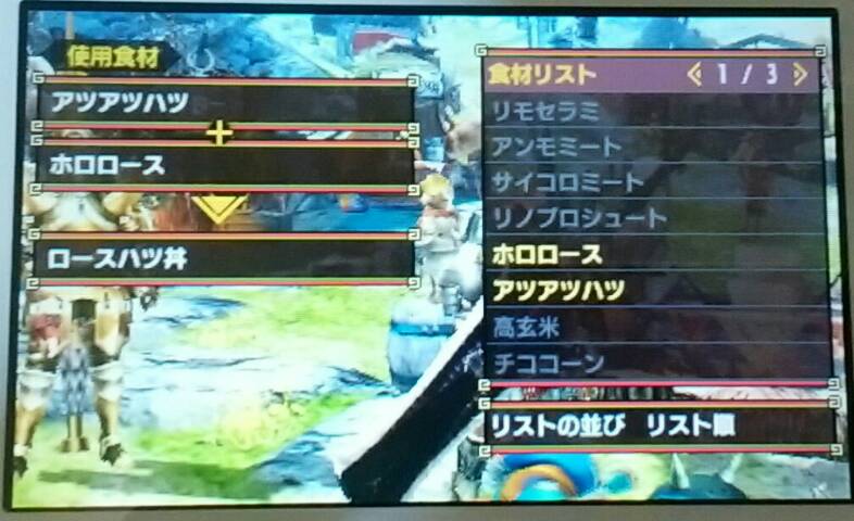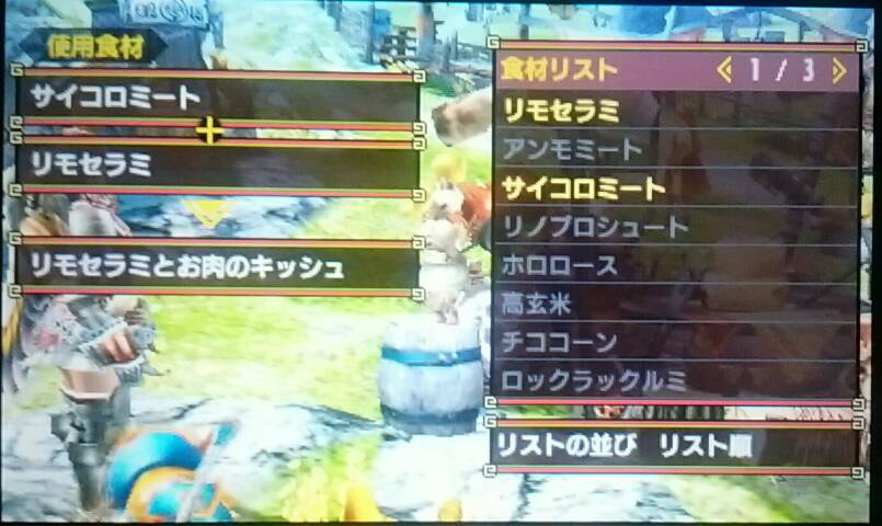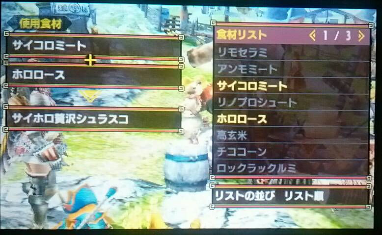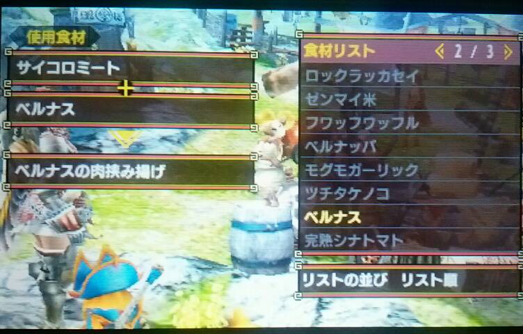 またメニューが増えたよ~【MHX】 モンハン 2016年02月09日 ユクモ村にいる食材屋の女将の依頼 集会所★★「食材の価値は鮮度なり」(ブルファンゴ20頭の討伐) をクリアしたらサイコロミートという食材をくれました。 早速ベルナ屋台のおかみの所に持って行って新しい料理を開発してもらいましょう! サイコロミート+リモセラミ=リモセラミとお肉のキッシュ サイコロミート+リノプロシュート=サイプロシュートの肉団子 サイコロミート+ホロロース=サイホロ贅沢シュラスコ サイコロミート+ベルナス=ベルナスの肉挟み揚げ サイコロミート+完熟シナトマト=シナトマ添えサイコロステーキ サイコロミート+モガ大トロ=モガ大トロール肉巻き 選べるって嬉しいよね。 お腹が空いてきました。 他のモンハン記事はコチラ→モンハン