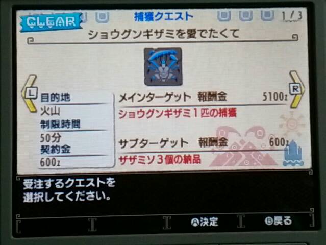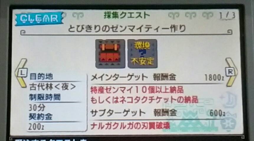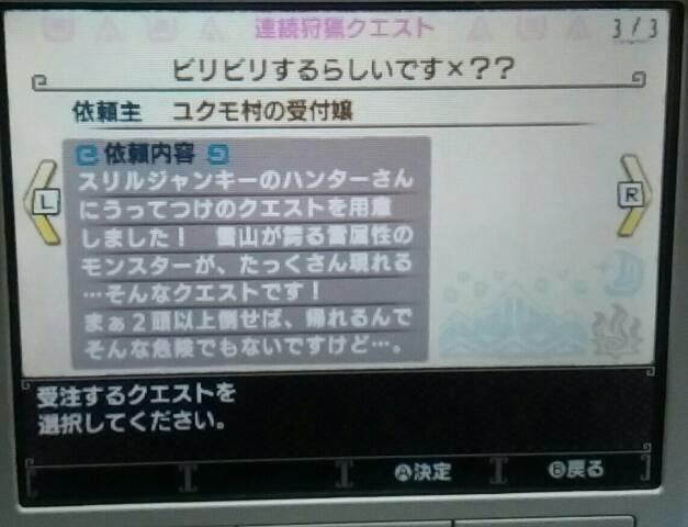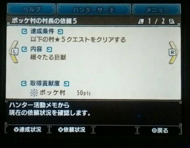 村クエ★★★★終わった~!【MHX】 モンハン 2016年01月26日 Twitter(モンハン部の狩猟日記)には書いていたのですが、村クエ★★★★「ショウグンギザミを愛でたくて」をクリアしたら緊急クエストが出てきました。 イャンガルルガの狩猟ですってよ。 コレ ↓ をクリアしたら出てきました。 この壷かわいいね ↓ オトモ達の活躍で(?)イャンガルルガを討伐しました~! あ、でも本当は、★★★★を全部終わらせてから緊急クエに行きたかったから先に全部埋めました。 勲章「ベルナ村長の杖」がもらえたよ。 村クエ★★★★まで全部終わらせて、緊急クエストのイャンガルルガ狩猟も終わったら、色々とできることや買える物が増えました。 「上鎧玉」「陽翔原珠」がポイントと交換できるようになりました。 モンニャン隊が「火山地帯」に行けるようになりました。 買える物も増えました。 ↑ 今のところ片手剣は使っていないのでコレは関係ないけど ↓ 物持ちの良いハンターなのでコッチは買っておこう ココット村の村長には「ライゼクス」を狩ってくれと頼まれ ココット村に錬金のコがいて(今回は錬金がないと勝手に思ってていらないお守りを既に売ってしまっていた~!) 剣を抜こうと寄り道してみた。 ポッケ村の村長には「ガムート」を狩ってくれと頼まれ、トレジィとは姉弟だという話をしてもらった ユクモ村の村長には「タマミツネ」を狩ってくれと頼まれ 足湯に浸かるカワイイまったりアイルーに癒された。 久し振りにイャンガルルガと闘ったら(クロスでは初めて?)ちょっと怖かった。 いよいよこの辺りから私の腕では大変になってくるのでしょうか?! 村長たちも強そうなヤツの討伐を依頼してきたし。 でも楽しみでもあります。 美しいタマミツネはもう一度見たいと思っていたし、ガムートは音楽がカッコ良かった。 ライゼクスは・・・特にないけど、USJで乗る予定なので(笑)慣れとかないとね。 一応、村クエが終わってから集会所(オンライン)デビューしようと思っているので、村だけは自力で頑張ろうと思っているけど、無理だったら先に集会所で装備を揃えたりするかもしれません。 村人達に頼まれた依頼の数々。 まずは直接頼まれた依頼から取り掛かろうかしら。 他のモンハン記事はコチラ→モンハン