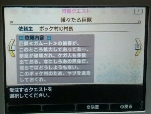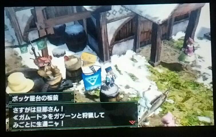 ガムート狩猟した&勲章「象毛のマフラー」「黒の腕輪」もらった【MHX】 モンハン 2016年01月27日 村クエ★★★★★やってます。 今回はポッケ村の村長から頼まれていたガムート退治をしました。 ガムートって音楽がカッコイイですよね♪ 今年こそは狩猟音楽祭に絶対行きたい~! (2014年は行ったけど、2015年は行けなかった) 勲章ももらえましたよ「象毛のマフラー」 ポッケ村の村長からなにやらお礼の品がもらえそうです チラッ 今後、ココで採掘させてくれるようです。 また勲章が増えました「黒の腕輪」 さぁ、どんどんやるぞ~! 他のモンハン記事はコチラ→モンハン