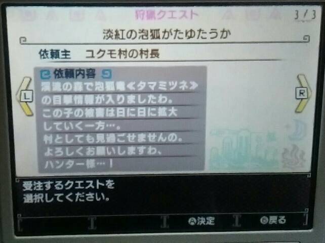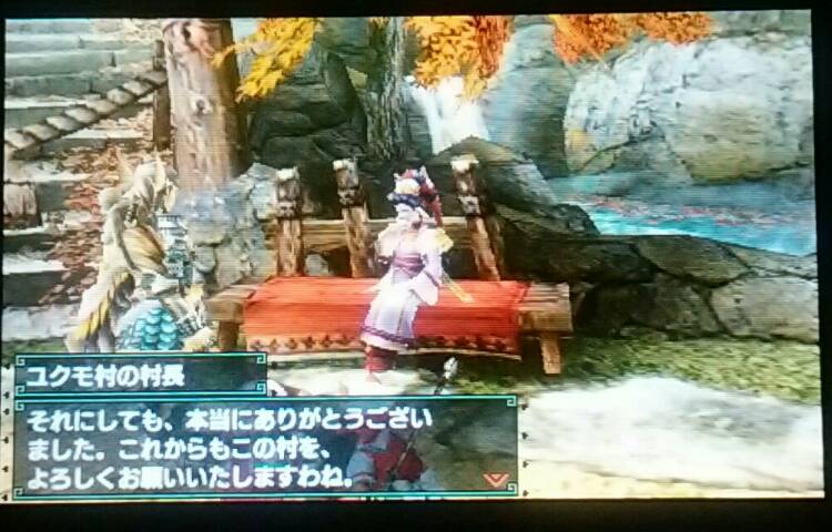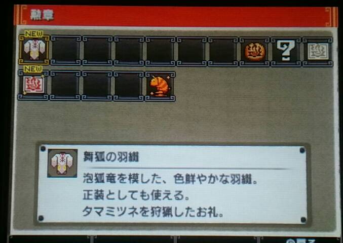 タマミツネ狩猟した&勲章「舞狐の羽織」もらった【MHX】 モンハン 2016年01月27日 調子に乗ってどんどんやりました。 村クエ★★★★★ 今回はユクモ村の村長からの依頼でタマミツネの狩猟です。 クエスト始まってすぐのムービーが可愛くて綺麗でかっこよくて気に入りました!! アイルー&タマミツネ!最高の組み合わせですね! あとからルームサービスのアイルーにお願いしたら見せてもらえるからまた見よ~ (ルームサービスをチェンジできるようになったけど、ルームサービスのアイルーが好きだからお試しで1回交代してみただけでそれ以降変更してないです) タマミツネはかっこよくて綺麗だけどちょっと怖かったです。 でも倒せました。 ユクモ村でも何かすごい物をもらえるかもと期待してしまっていた自分が恥ずかしい・・・。 そんなに特別なお礼の品はなかったです(笑) 良いんです、良いんです。 村長、美人だし← 勲章「舞狐の羽織」をいただきました オトモのこの装備 ↓ やっと作れるようになりました。 私のTwitterアカウントのアイコンがコレ ↑ を装備しているアイルーなんです。 モンハン部でもらったんですよ。 今はご覧の通り必要な素材が不足していますけど、作るわ! ハンターの装備より先に作っちゃうわ! 本末転倒なのニャ! 他のモンハン記事はコチラ→モンハン