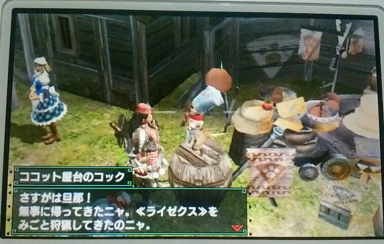 ココット村の受付嬢の納品依頼は完了【MHX】 モンハン 2016年01月26日 村★★★★と緊急クエストが終わってからすぐにココット村の受付嬢に頼まれていた品は、すべて納品できるものだったので、報告に行きました。 狩りに行ってみたいんだって ↓ 納品のお礼として受付嬢のコスプレ装備?を作れるようにしてくれました。 ハンターの分は作ってないけど、オトモの装備は早速作っちゃいました(^・ω・^) 他のモンハン記事はコチラ→モンハン