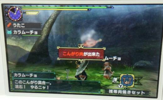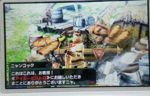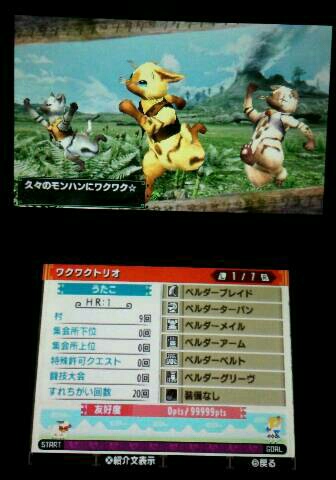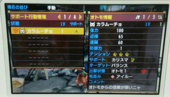 MHXやってみた 2/2 モンハン 2015年11月28日 「MHXやってみた 1/2」の続きです。 文章が多くてもつまらないと思うので、写真多めで。 買おうか迷ってる方には一言、「おもしろいですよ!」と言いたい。 買っても良いと思いますけどね~。 でも、ハマりすぎ注意ですね~。 では、続きを。 村長からの依頼クエスト?をやっと受ける事になった私。 でも、まだ「オトモ広場」とかいう所にも行ってないし、寄り道しちゃうよ。 黄色の「・・・」を残したままクエストに行くの気になるし。 っていうか、この広場いいな。 近所にあったら毎日散歩に行くだろうな。 ココにもムーファ。 撫で回してやる! モフモフモフモフ・・・ ねこバァじゃなくてネコ嬢になってる! 小さい! 将来ねこバァになるのかな~。 馬車(ムーファ車)に乗せられているアイルー。 かわいい! 早速、最初のオトモをネコ嬢からいただきました。 湖池屋のカラムーチョが大好きなので、筆頭(という概念が今回あるのか知らんが)オトモはカラムーチョにしようと思ってました! これが後にビックリすることになるんですよね。 次の記事に書くので良かったら読んでくださいね。 クエストを受ける前にちゃんとオトモボードからオトモに設定するのをお忘れなく~。 集会所に移動しました。 なんだかあんまり可愛くないアイルーですね。 とりあえずデカ過ぎるよねw いっぱい食べてたらこうなったみたいです。 あ、この人に会ったらHRが1とかになった気がします。 たぶん。 さぁ、やっとクエスト受注する気になりました(笑) 最初はそうだよね、納品だよね。 オトモのカラムーチョも忘れずに装備させて連れて行きます。 ケチなので食事はしませんでした。 イケルでしょ、採集なら。 始まった直後の画面。 ボケボケで申し訳ない・・・。 今まで私がやったモンハンにはないフィールドですが、体験版で見た気がします。 下のパネルが使いにくい。 後で考え直そう。 黄色ケージがヤバくなってきたので、肉を焼いてみました。 流石に肉焼きのタイミングも覚えていたわ。 ムシャムシャムシャムシャ。 あ、途中の写真を撮る余裕がありませんでした。 ごめんなさい。 久し振りだから色んなことが新鮮でついウロウロしてたら時間がやばかったw オトモのレベルがいきなり3まで上がりました。 コレはMH4のパネルの写真です。 初期設定のままだとやりにくかったので、MH4を参考にMHXも考え直そうと思います。 そんな感じでクエストは簡単にクリアできました。 まだやってないけど、以前に私がプレイした事あるモンハンと違っていきなり通信プレイできそうな感じです。 やってないからわかんないけど。 やってみたらまた書きます。 良かったら「MHXやってみた オマケ」もどうぞ