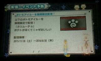 MHXやってみた オマケ モンハン 2015年11月29日 そうそう、今回モンハン始めてすぐに「ダウンロード」を確認したのですが、まだ準備中でした。 最初のクエストが終わった頃、もう一度見てみると、色々ダウンロードできる状態になっていました。 ・イベントクエスト「サンリオ・ひとぐでしようぜ」 ・オトモ「ぐでネコ」「カリーヤン」「カリムーチョ」 ・アイテム「ハチミツ99個」 ・称号「ムリだから」「だりぃ~・・・」「モンでき。」「つながる~」「カプコンTV!」 ちょっと、ちょっと! 何かに気付きませんでしたか? 配信オトモ「カリムーチョ」ですよ! コイケヤさんの。 私の筆頭(というか一匹目)の「カラムーチョ」と丸かぶりです! ビックリして1人で大騒ぎしましたよ、という話です。 ややこしくなるけど、もちろん雇います。 「MHXやってみた 1/2」 「MHXやってみた 2/2」も良かったら読んでみてくださいね。
