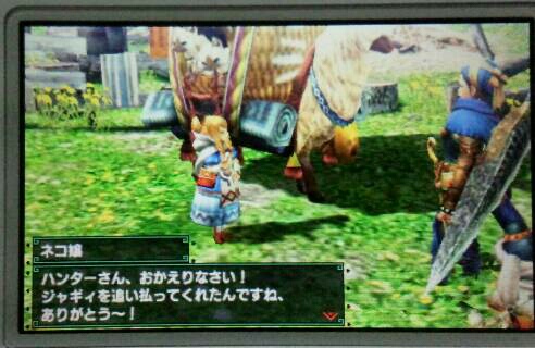 ニャンターモードやってみた モンハン 2015年12月02日 その後、ほとんど朝みたいな時間にニャンターをやってみました。 体験版で1回やった以来です。 本番は初めて。 特に訓練とかはしませんでした。 最初のクエストだしなんとかなるかな~と思って。 ただのスタート画面がもうなんだかかわいい 装備は、ニャンターとオトモ1だけ。 オトモ2は裸です。 ごめん。 でも《特産ゼンマイ》の納品なら大丈夫でしょう。 色々あって・・・ ホラ、大丈夫だった。 ニャンターはお腹が空かないみたいですね。 採集ならニャンターの方が良いって事かなぁ? 肉とかも焼けないみたいだから肉焼き器も持っていかなくて良いです。 アイテムポーチのサイズは同じっぽいです。 クエスト終了後、オトモ広場に行ってみました。 ムーファの背中に乗ってゴロンゴロン (ハンターの「撫でる」と同じみたいです) ゴロンゴロンされてムーファも喜んでいます。 ニャンターもかわいいし、ムーファもかわいいし、こりゃニャンターモードでずっと撫で回してたいですな。 部屋ではフェニーを抱っこします。 抱っこっていうか重量挙げみたいになってるw 続く 他のモンハン記事はコチラ→モンハン