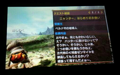 緊急クエストではなかったけど、緊急クエストも出た モンハン 2015年11月30日 前回、村長の頭の上に出ていた赤い「・・・」 どうやら、緊急クエストではなかったようです。 ネコ嬢さんの困り事を解決してやって、という内容でした。 具体的なクエスト内容はこちら。 ジャギィ10頭の討伐です。 簡単、簡単。 どういたしまして~ そしてこの後、本当の緊急クエストを受ける事になりました。 ドスマッカォって誰? カプコンの公式サイトにもある通り新モンスターですね。 えーい!とうっ!でやぁー!! 倒しました。 緊急クエストをこなしたので、村人も私にかなり期待している様子・・・。 ★★のクエストも受注できるようになりました。 他の村へも飛行船に乗って行けるようになったみたいです。 旅の商人によると・・・ ココット村 ポッケ村 ユクモ村 に行けるようです。 ポッケ村はMHP2Gで、ユクモ村はMHP3でハンターとして生活していたので、里帰り気分です。 ココット村は名前ぐらいは存じております、程度ですね。 飛行船窓口です。 楽しみです。 他のモンハン記事はコチラ→モンハン