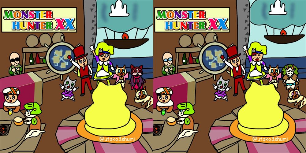 モンハン間違い探し【MHXX】正解編1 モンハン 2019年03月10日 ネタバレ注意!! 前回の「モンハン間違い探し【MHXX】問題編1」の正解を発表するページです。 まだ挑戦してないハンターさん、まずは自力で探してみて~。 ↑ コレは問題(クリックで拡大画像が開きます) 正解はこちらです!(クリックで拡大画像が開きます) ↓ ①右にいるニャンターの装備 (呪猫→マメダイフク) ②飛行船の大きさ ③右上の女ハンターの顔 (うたこ→ハーマンリ) ④酒場の受付のサングラスがメガネに ⑤右端にいるオトモの片目の色 ⑥左下の座っているハンターのドリンクの色 ⑦クエストボードが左右反転している ⑧中央付近にいる男ハンターの襟の開き具合 (デカマルコ) ⑨右下のテーブルにある猫チーズ右耳部分の溶け具合 ⑩左上「MONSTER HUNTER XX」の最後の「R」の影の太さ 以上、10ヶ所でした~。 どうでしょう?本家に負けず劣らず難しかったと思います。 特に⑩はすぐに見つけられない人が多かったのでは? 楽しく頑張って描いたので遊んでもらえて嬉しかったですよ。 ありがとうございました。 また気が向いたら第二弾を描きたいと思ってるので、その時はまた遊んでくださいね。 またね~。