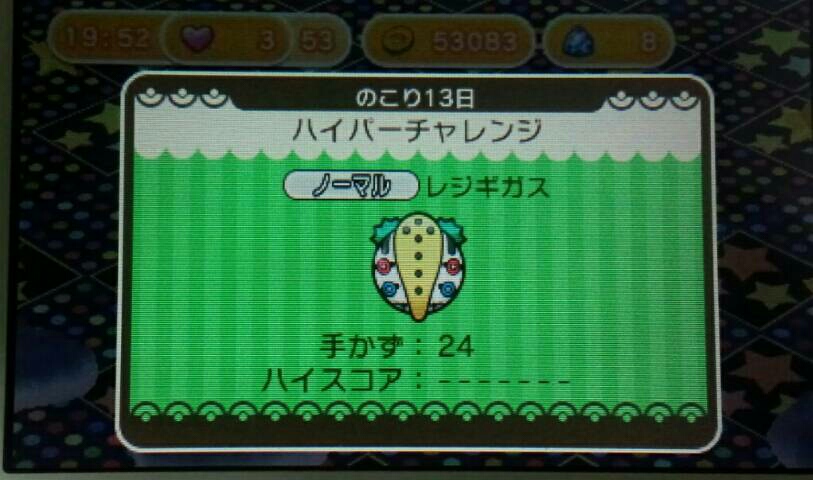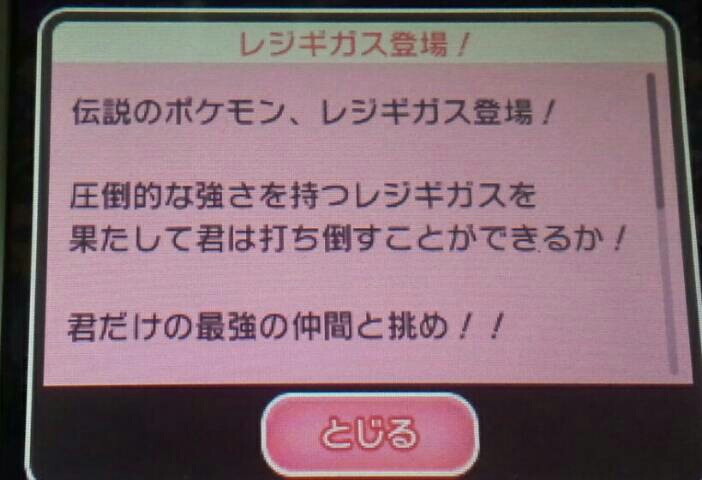 レジギガス欲しいね【ポケとる】 ポケとる 2015年12月15日 ポケとるのイベントステージで新しいのが出てきました。 ハイパーチャレンジの「レジギガス」 見た目がちょっと気持ち悪いと思うのは私だけでしょうか? 伝説のポケモンらしいです。 どのパーティで行けばいいか教えてくれちゃってます。 ウチのレジロック、レジスチル、レジアイスはレベルが低いです。 一度これでやってみましたけど、ギリギリのところで負けました。 なので、しばらくレベル上げしようと思います。 こちらの開催期間は 2015/12/28 15:00 までです。 それまでには、全員レベルMAXは無理でも、なんとかレジギガスのGETはしたいと思います。 ランキングステージも増えてました。 「メガガブリアス」です。 50000位までに入ると「ガブリアスナイト」がもらえます。 私のように既に「ガブリアスナイト」を持っている場合には、入賞したらホウセキがもらえるようです。 開催期間は 2015/12/22 14:00 までです。 頑張りましょう。 アイテム未使用でとりあえず一度やってみました。 今のところ入賞してるけど、たぶん締め切り前には落っこちるからまたやろうと思います。 超ゲットステージというのもあります。 「ミュウツー」登場です。 私は既に持っているのでやらないけど、コインで購入しなくてもアイテムが使えるステージらしいのでGETしやすいんじゃないでしょうか? 開催期間は 2016/1/19 15:00 までです。 次から次へと出てくるから嬉しい悲鳴?ですね。 「ポケモンピクロス」もDLしたけどまだ開いてません。 「MHX」もやりたいし忙しいわ~。 他のポケとる記事はコチラ→ポケとる
